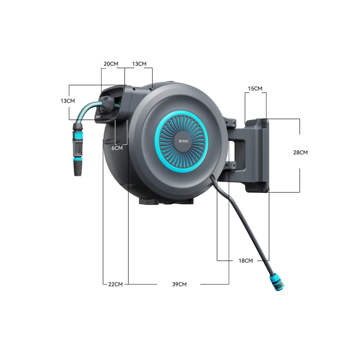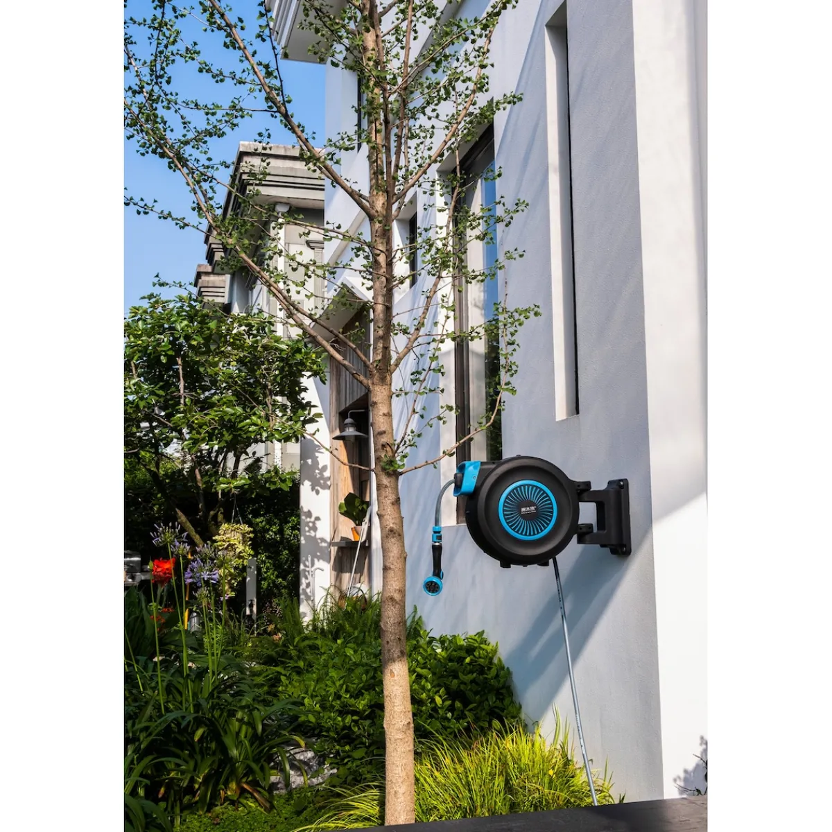 Diese Box hat Ihren Gartenschlauch fest im Griff: Sagen Sie „tschüss“ zu Bücken, abknickenden Schläuchen, dreckigen Händen und lästigen Stolperfallen. Dank der kurzen Arretierstopps lässt sich der Schlauch ganz einfach auf die gewünschte Länge ausfahren – der Einzug erfolgt automatisch und in gleichmäßiger Geschwindigkeit. Box um 180°schwenkbar. Inkl. Handbrause und Wandhalterung.