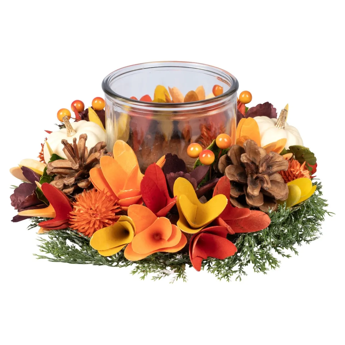 Sobald eine Flamme in diesem Windlicht tanzt, wirft sie ihren warmen Schein auf den rundum arrangierten Kranz und bringt dessen Herbstfarben zum Strahlen.