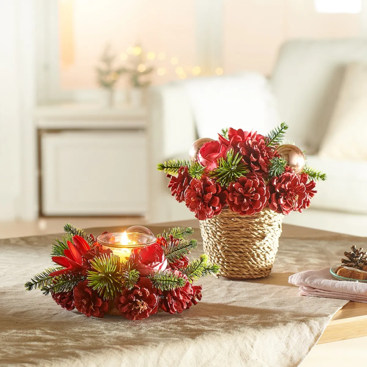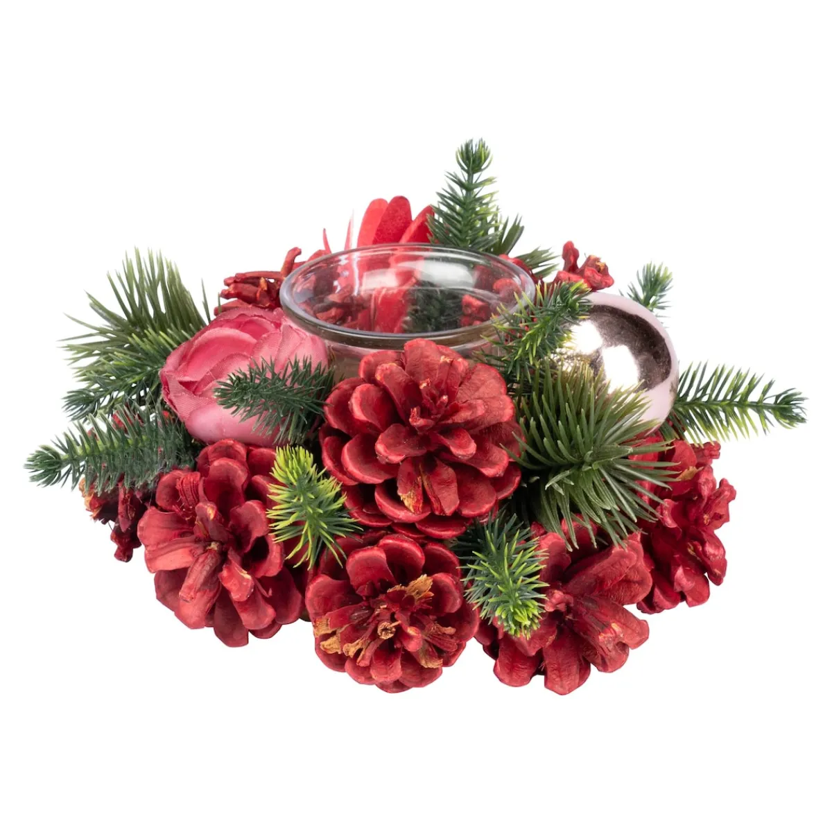 Dieses festliche Windlicht mit roten Zapfen bringt winterlichen Zauber in Ihr Zuhause! Üppig dekoriert mit echten Kiefernzapfen, Kugeln und Zweigen, setzt es wunderschöne, feierliche Akzente. Ideal, um Ihre Weihnachtsdekoration zu ergänzen und Ihrem Wohnraum einen Hauch von Natur und Eleganz zu verleihen!
