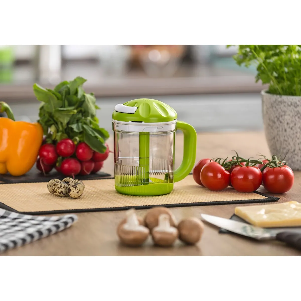 Dieser praktische Küchenhelfer macht das Zerkleinern und Mixen kinderleicht – ganz ohne Strom! Mit den 5 ultra-scharfen Klingen zerkleinern Sie selbst harte Lebensmittel wie Eiswürfel, Nüsse oder Parmesan mühelos. Der 625 ml große Behälter bietet genug Platz für Suppen, Saucen oder Kräuter. Dank des rutschfesten Designs und handlichen Griffs liegt er sicher in der Hand. Perfekt für Dips, Dressings und vieles mehr – in nur wenigen Sekunden einsatzbereit!