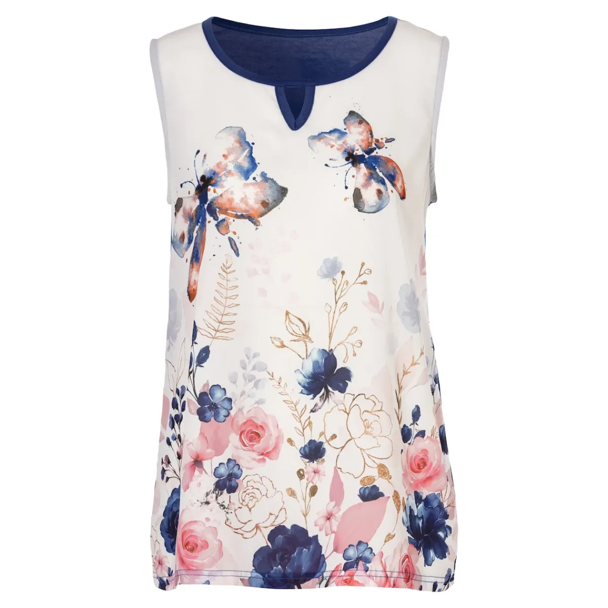 Dieses Blusenshirt ist ein wahrer Glücksgriff für Ihre Sommergarderobe! Mit flatternd leichten Motiven auf der Vorderseite und der frischen azurblauen Rückseite bietet es nicht nur einen tollen Look, sondern auch angenehmen Tragekomfort an heißen Tagen.