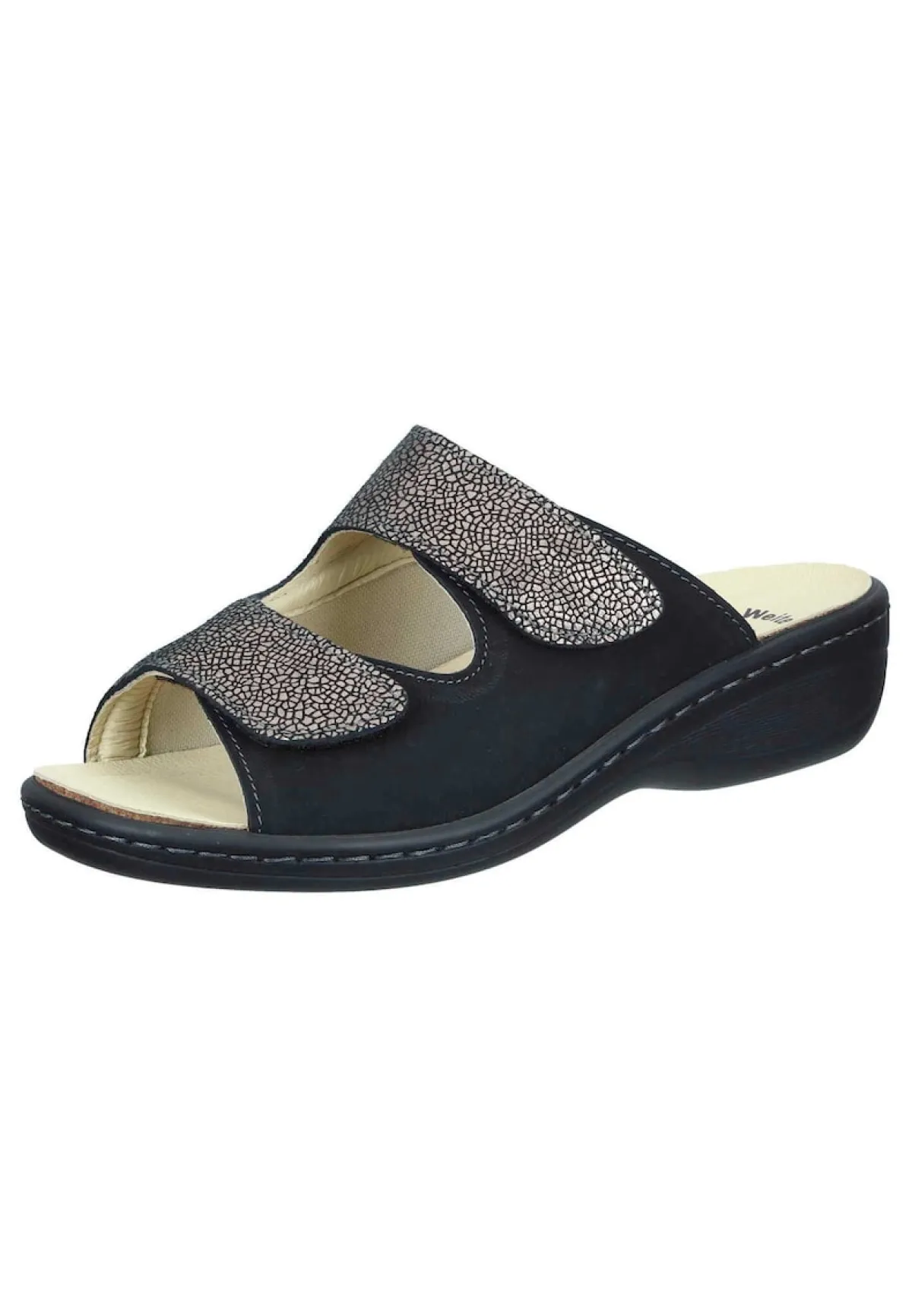 Bei diesem Produkt handelt es sich um einen Schuh aus der Kategorie Komfort-Pantoletten für Damen. Als Obermaterial wurde Nubukleder verwendet und im inneren Bereich des Schuhs wurde Lederfutter und Lederdecksohle, herausnehmbares gepolstertes Naturform-Fußbett verarbeitet. Die Schuhweite dieses Artikels ist Weite K und somit für sehr kräftige Füße. Als Verschlussart wurde Schlupfschuh gewählt und die PU-Sohle mit Gummiintarsie rundet das Produkt ab. Der Artikel fällt normal aus, bitte die gewohnte Größe bestellen. – Schuhweite: Weite K –