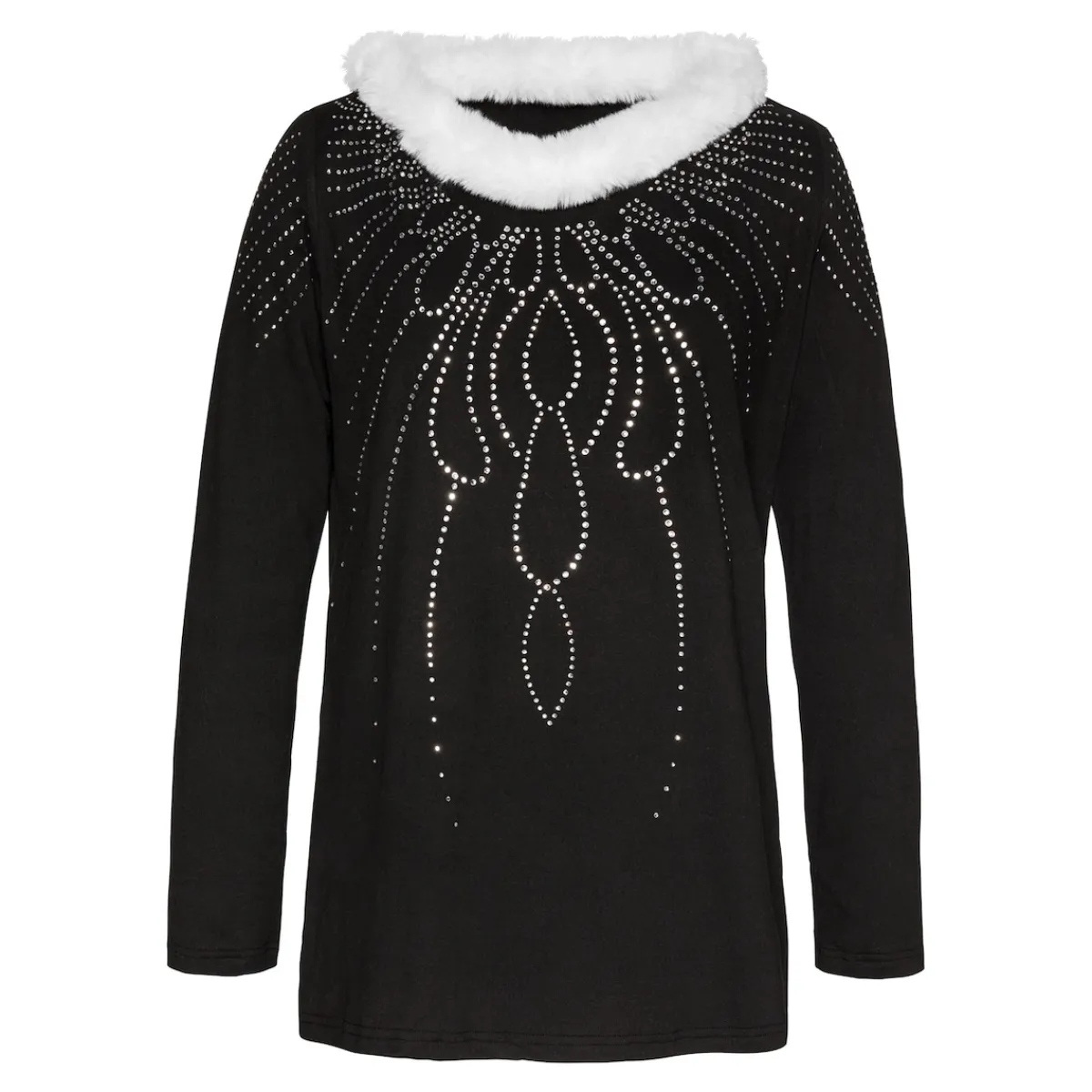 In diesem raffinierten Langarmshirt werden Sie zur Eisprinzessin auf jeder Feier! Der schneeweiße, weiche Kunstpelz-Kragen und die glitzernden Eisregen-Applikationen machen es so besonders.