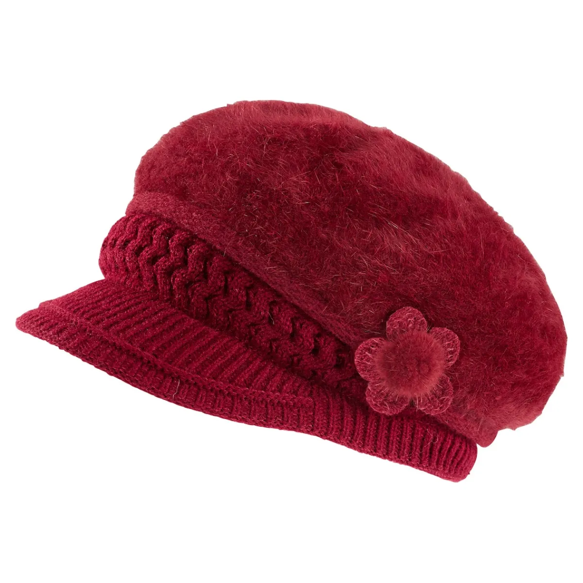 Das außergewöhnliche Design besticht durch die Kombination verschiedener Strickmuster und Felloptik. Eine kleine Blume in gleicher Farbe ist als raffiniertes Highlight auf der Seite angebracht. Doch nicht nur optisch strahlt die Mütze Gemütlichkeit aus. Dank kuscheligem Innenfutter hält sie auch schön warm. Praktisch: Sie passt bis zu einem Kopfumfang von 58 cm.
