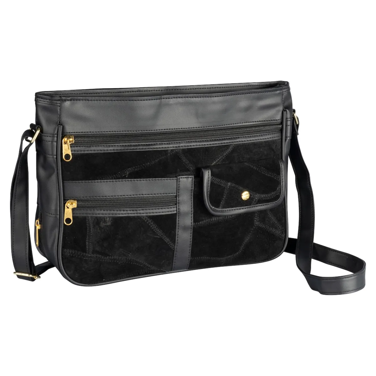 Ein echtes Unikat zum Verlieben! Diese elegante Tasche vereint Charme und Handwerkskunst: Mit ihrer einzigartigen Struktur und den verschiedenen Ledertexturen bringt sie Schwung in jedes Outfit – und darf in Ihrer Garderobe keinesfalls fehlen! Mit großem Hauptfach, 2 Reißverschlussfächern außen, Frontfach mit Druckknopf sowie „geheimem“ Reißverschlussfach unten. Verstellbarer Trageriemen bis 130 cm.
