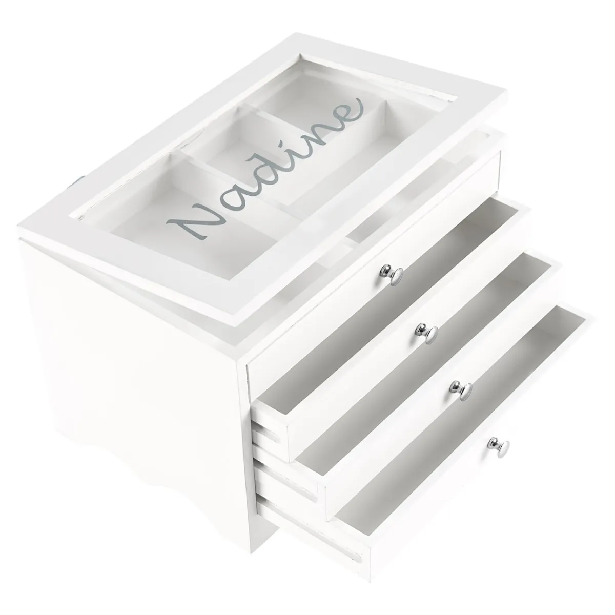 In diesem edlen Schmuckkasten sind Ihre Accessoires stets sicher und stilvoll aufbewahrt! Die 3 Schubladen bieten ausreichend Platz für große Ketten, Ringe, Ohrstecker, Uhren u. v. m. Glasplatte personalisierbar (bitte bei der Bestellung angeben). Lieferung ohne Inhalt.