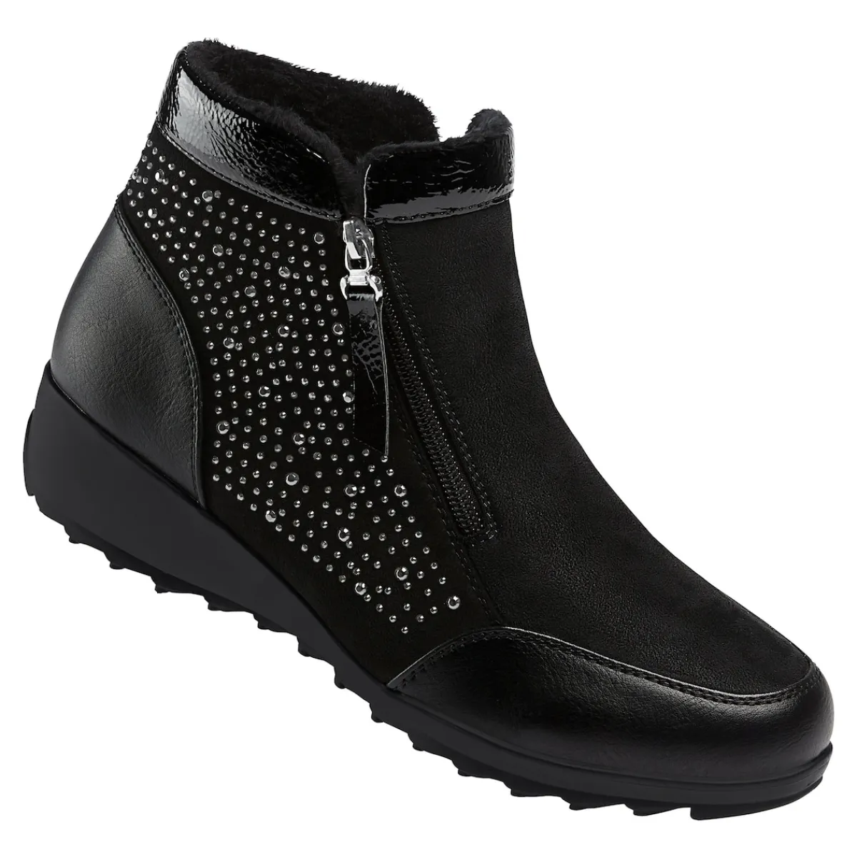 Mit der Damenstiefelette „Rita“ verleihen Sie Ihren Outfits das gewisse Etwas. Diese elegante Stiefelette zeichnet sich durch einen glamourösen Materialmix und funkelnde Glitzersteinchen aus. Der doppelte Reißverschluss ermöglicht einen mühelosen Ein- und Ausstieg. Das weiche Kunstfell-Innenfutter sorgt für wohlige Wärme an kühlen Tagen. Ein rutschhemmender Gummi-Absatz gewährleistet einen sicheren Tritt, sodass Sie in jeder Situation stilvoll unterwegs sind. Gönnen Sie sich die „Rita“ und erleben Sie Komfort und Eleganz in Ihrer Lieblingsfarbe.