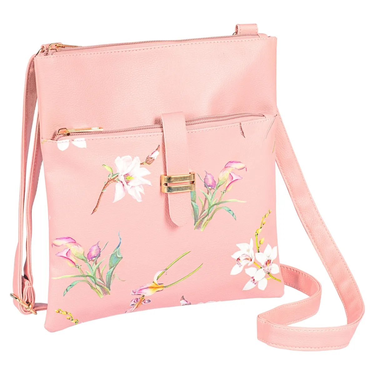 Diese floral-gemusterte Tasche bietet Platz für alle wichtigen Dinge. Mit Reißverschuss und verstellbarem Trageriemen.