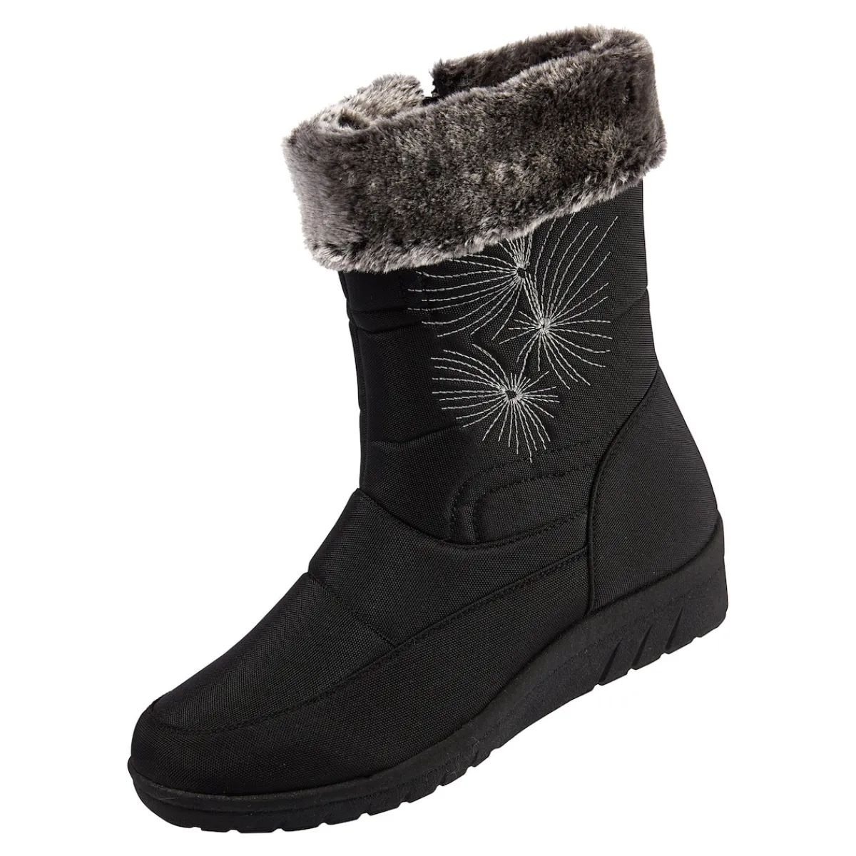 So modisch sind Winterstiefel heute: mit aufwendiger Schneeflocken-Stickerei und schönem Kunstfellrand. Das wärmende Futter verspricht ein angenehmes Fußklima, die profilierte Laufsohle unterstützt einen sicheren Tritt. Leichter Einstieg dank Reißverschluss.