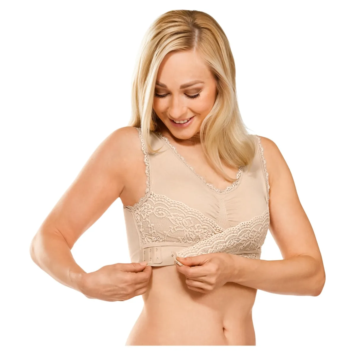 Unser Wunder-BH zaubert ein traumhaftes Dekolleté und verzichtet dabei komplett auf lästige Haken oder Verschlüsse am Rücken! Einfach über den Kopf ziehen, vorne schließen, und schon sitzt er wie angegossen – ein fabelhaftes Gefühl!