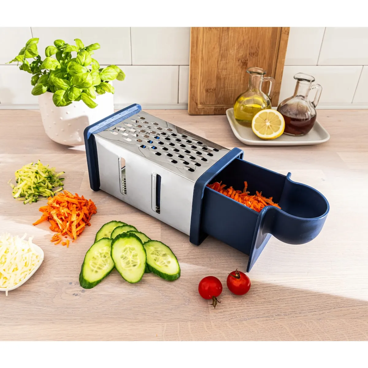 Diese vielseitig einsetzbare Reibe mit 4 verschiedenen Seiten erleichtert die Küchenarbeit. Damit hobeln Sie Parmesan, reiben Karotten, schneiden und raspeln Gurken im Handumdrehen. Mit Auffangfach, Anti-Rutsch-Fuß und handlichem Griff.
