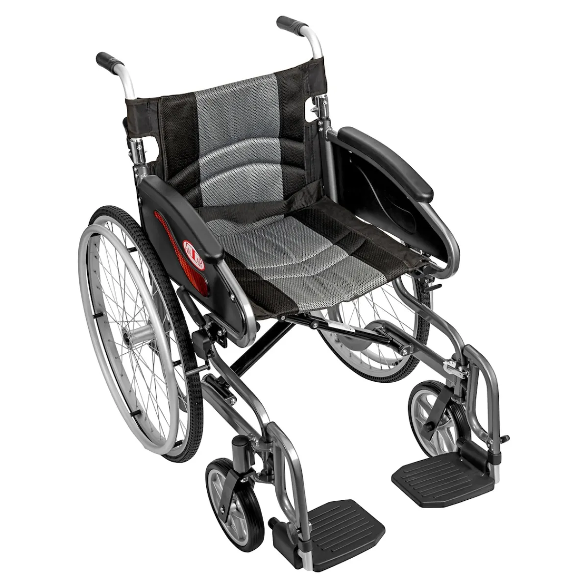 Ein Modell der Extraklasse: leicht, mit modernem S-förmigen Aluminiumrahmen. Fußstützen schwenkbar und abnehmbar, Rückenlehne klappbar. Mit Wabenhinterrad für Stoßdämpfung. Vorradgabel Hochleistungs-Aluminium. manuelle Bremse. Rückenlehne und Sitzfläche aus pflegeleichtem Material, bequem gepolstert.