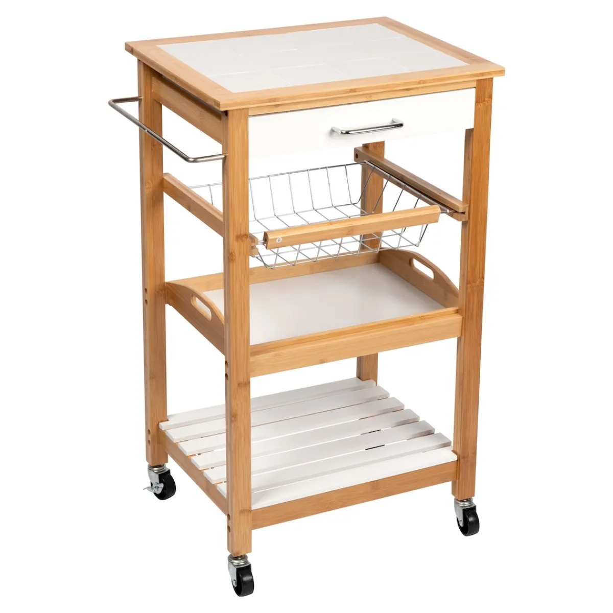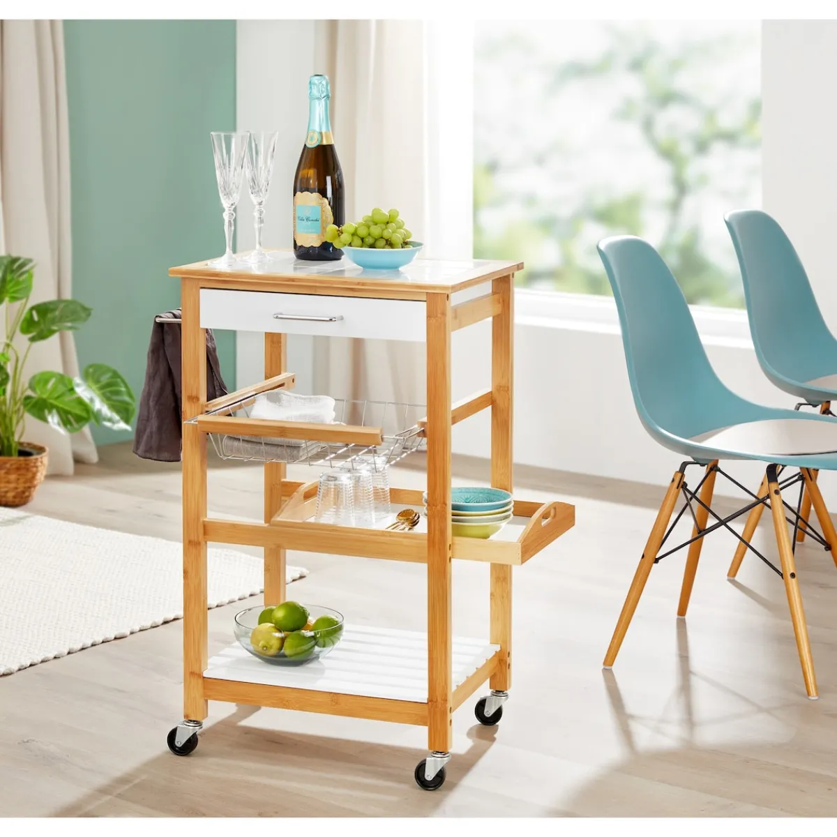 Ein fleißiges Helferlein für alle Fälle: Ob für Vorräte in der Küche oder als Servierhilfe – dieser Multiwagen ist Ihnen jederzeit zur Stelle. Mit seinem eleganten Design fügt sich der Rollwagen in jedes Ambiente ein. Mit Halterung für Lappen oder Geschirrtuch.