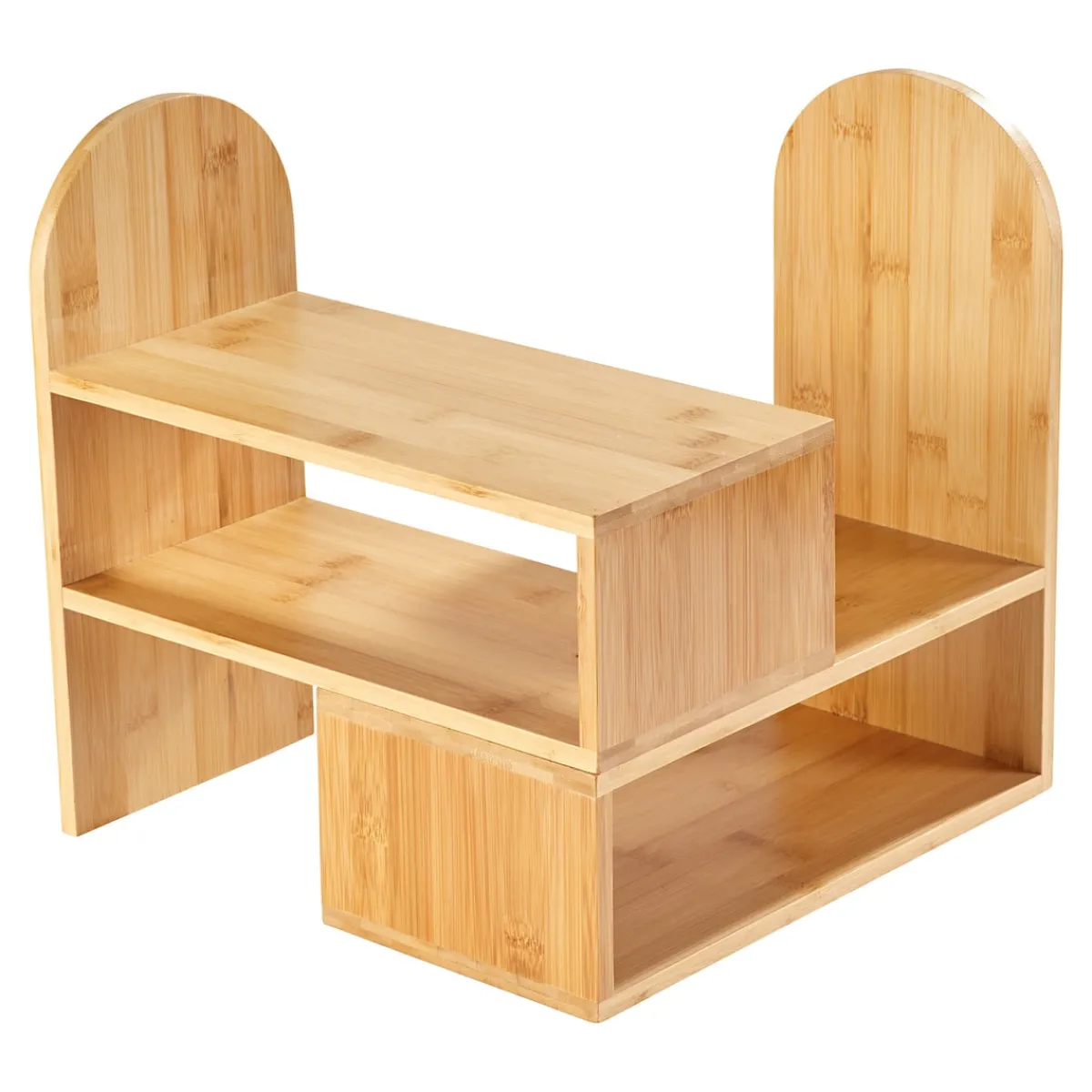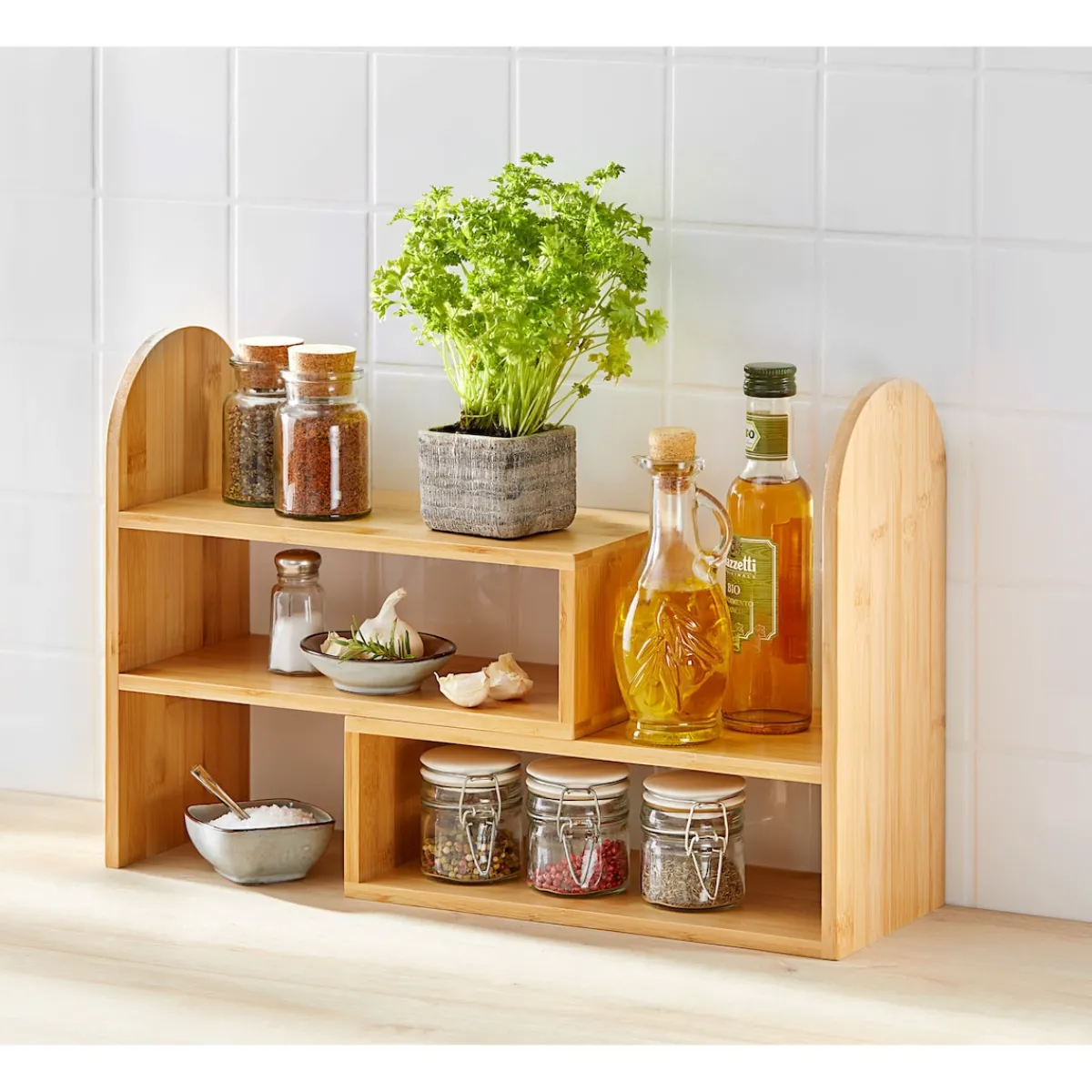 Schaffen Sie auf stilvolle Weise zusätzlichen Platz in Ihrer Küche! Das durchdacht konzipierte Bambus-Regal bietet auf seinen 3 Etagen Stellplatz für Ihre Gewürze, Tassen, Schüsseln u. Ä. Sie können es auch ruck, zuck zu einem Eckregal umfunktionieren und individuell Ihren Küchenverhältnissen anpassen.