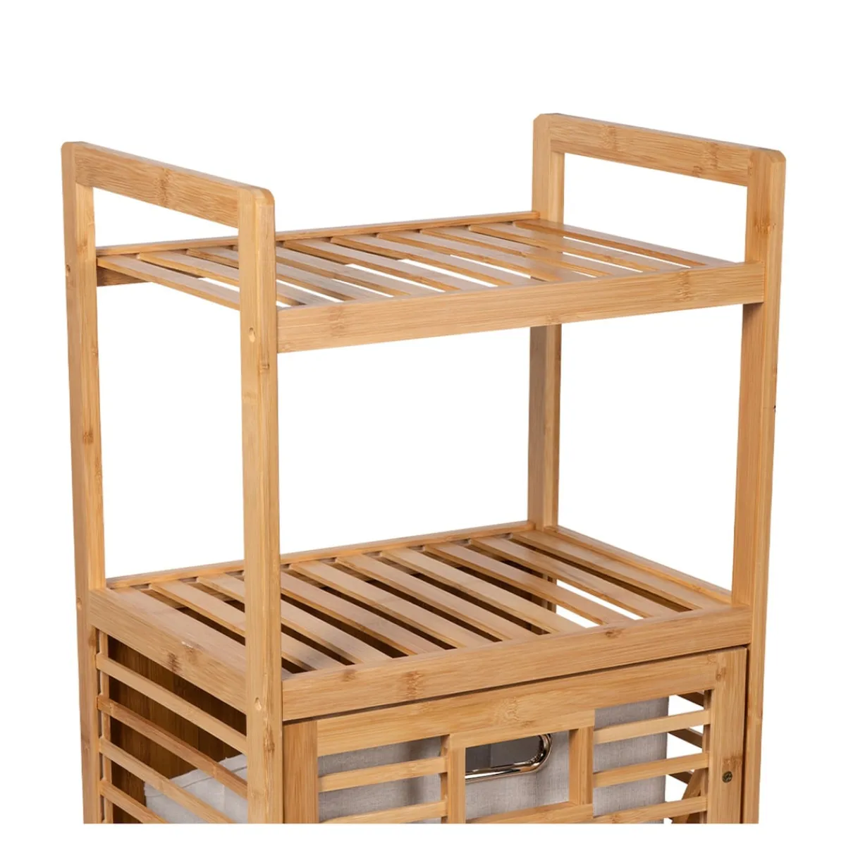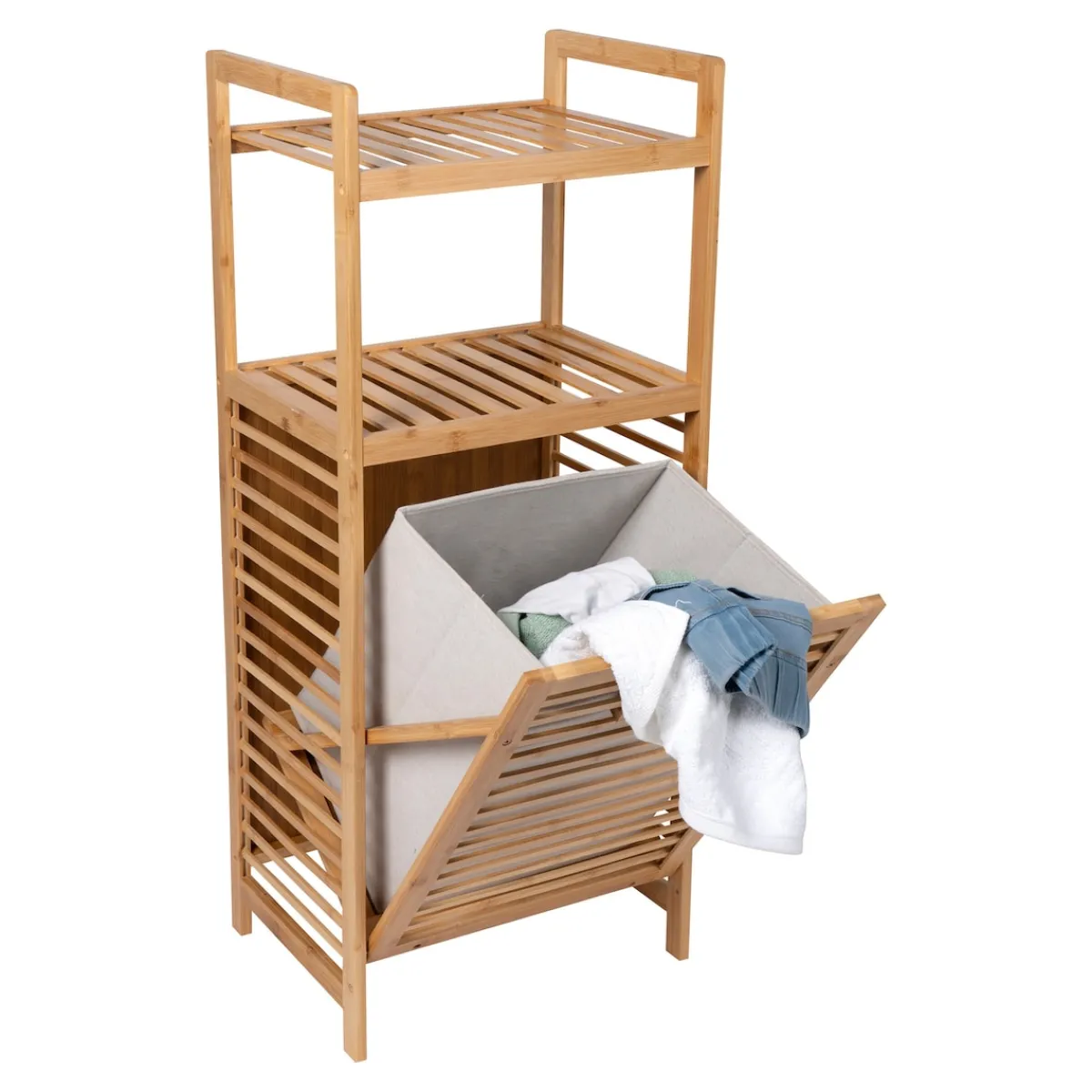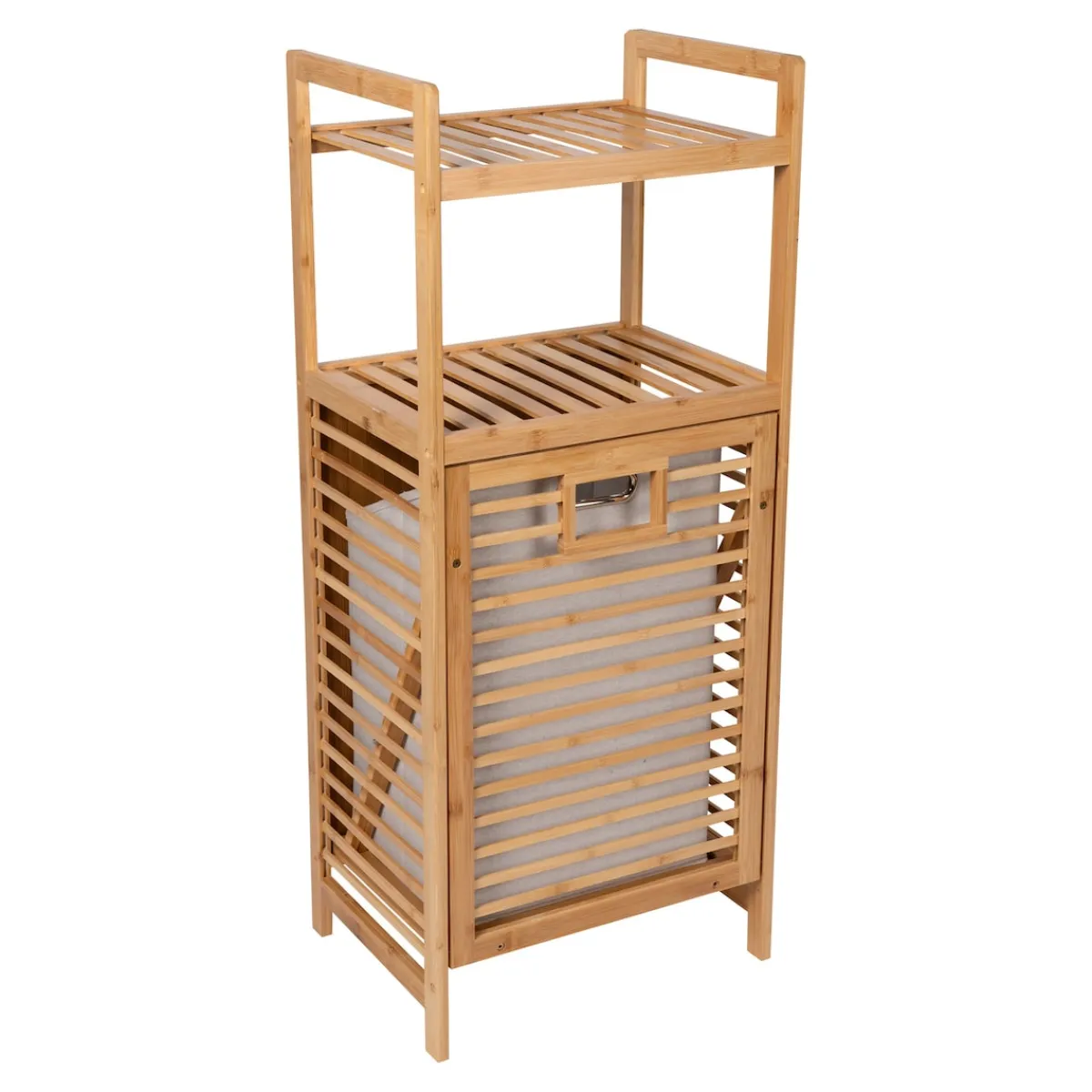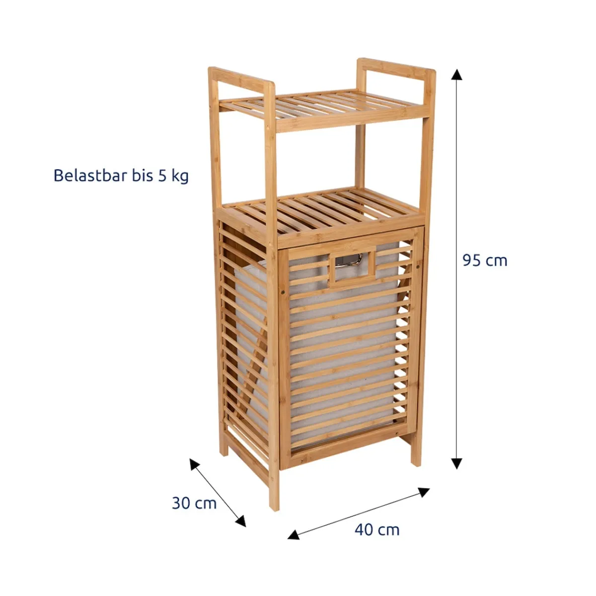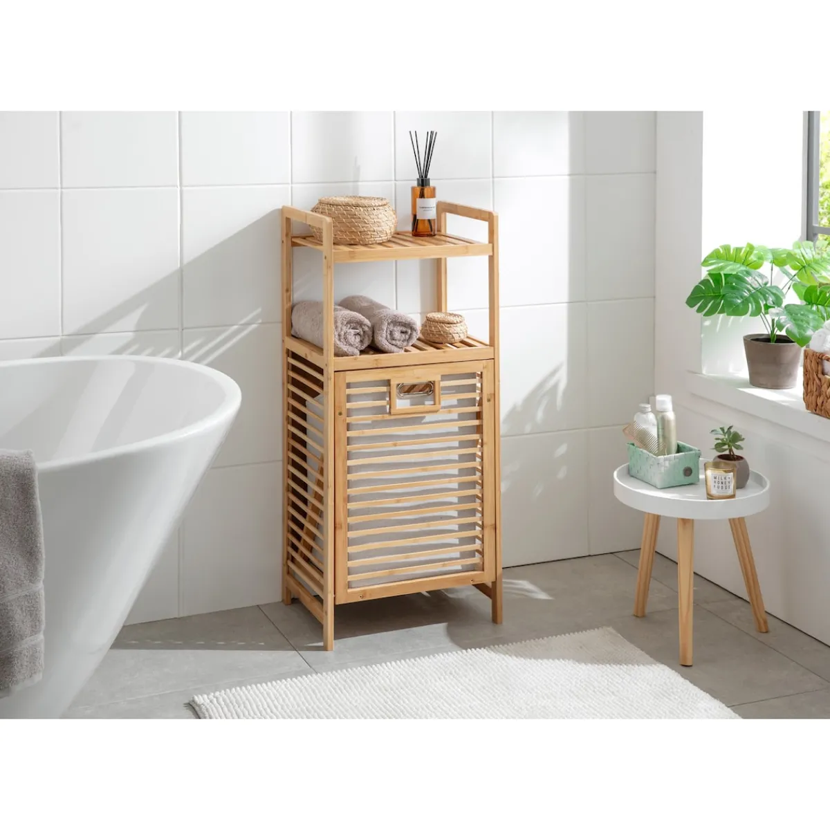 So einfach kann getragene Kleidung bis zum Waschen gesammelt werden! Hinter der Vorderfront dieses Bambus-Regals verbirgt sich ein geräumiges Klappfach, das beim Ordnunghalten hilft. Auf den beiden offenen Regalböden darüber ist außerdem viel Platz für Ihre Badutensilien.