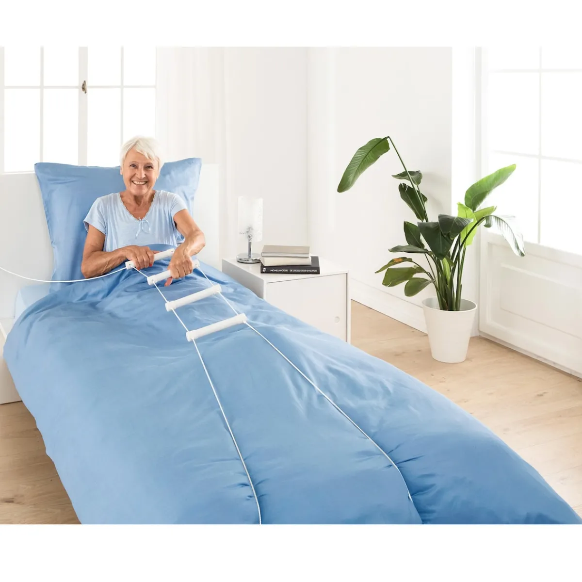 Damit können sich Patienten aus der Rückenlage mühelos im Bett aufrichten. Einfach mit einem Seil am Bettgestell oder Bettpfosten zu befestigen. Mit 4 Sprossen.