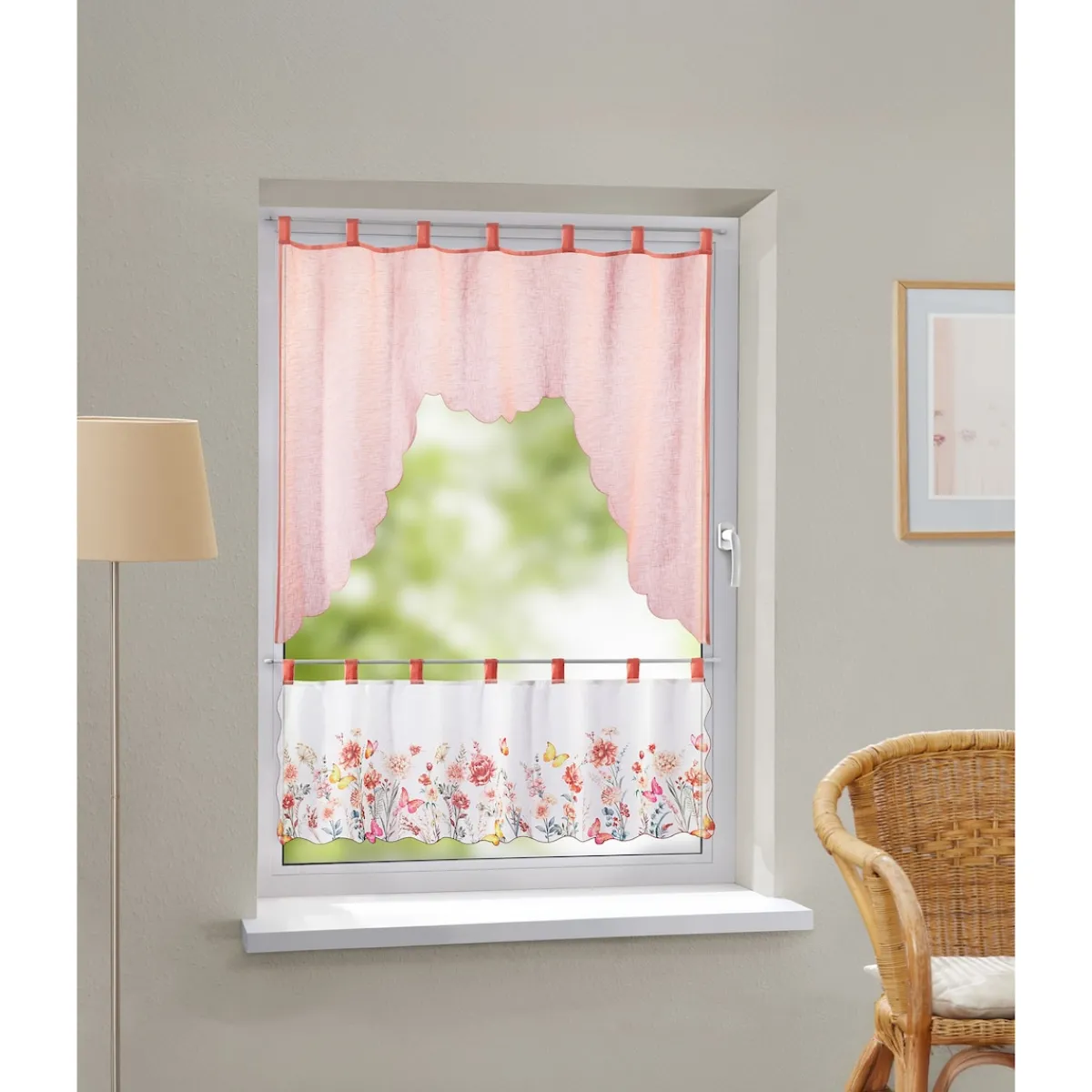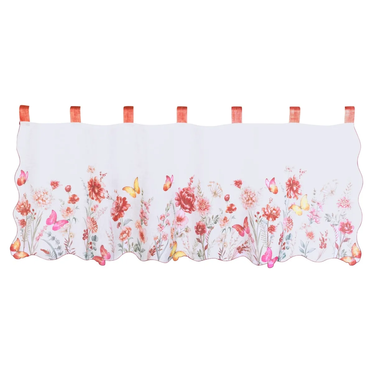Die Bistrogardine „Blumengarten“ bringt mit ihrem hochwertigen, floralen Design frische Sommerstimmung in Ihre Wohnräume. Die liebevoll gestalteten Blumenmotive verleihen Ihrem Fenster einen freundlichen und dekorativen Akzent – ideal für Küche, Essbereich oder kleine Fenster.