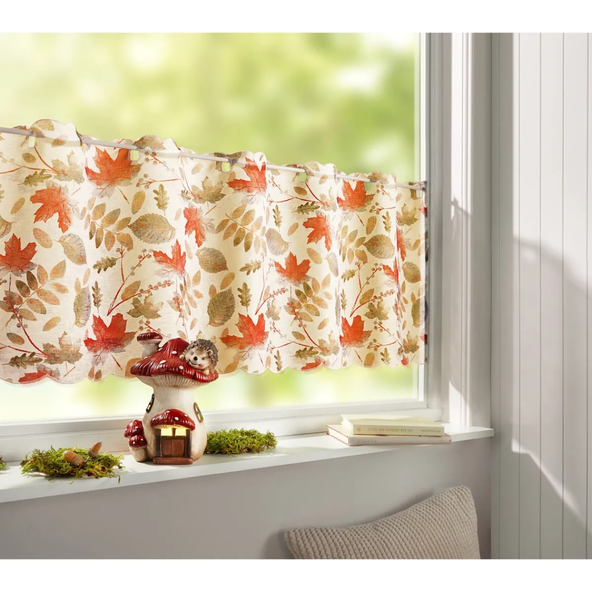 Selbst wenn die Bäume draußen kahl werden, erfreut Sie diese hochwertige Bistrogardine im Blätterdesign noch lange mit ihren geschmackvollen Farben und den eingearbeiteten goldfarbenen Akzenten!