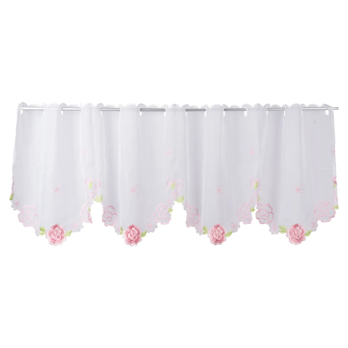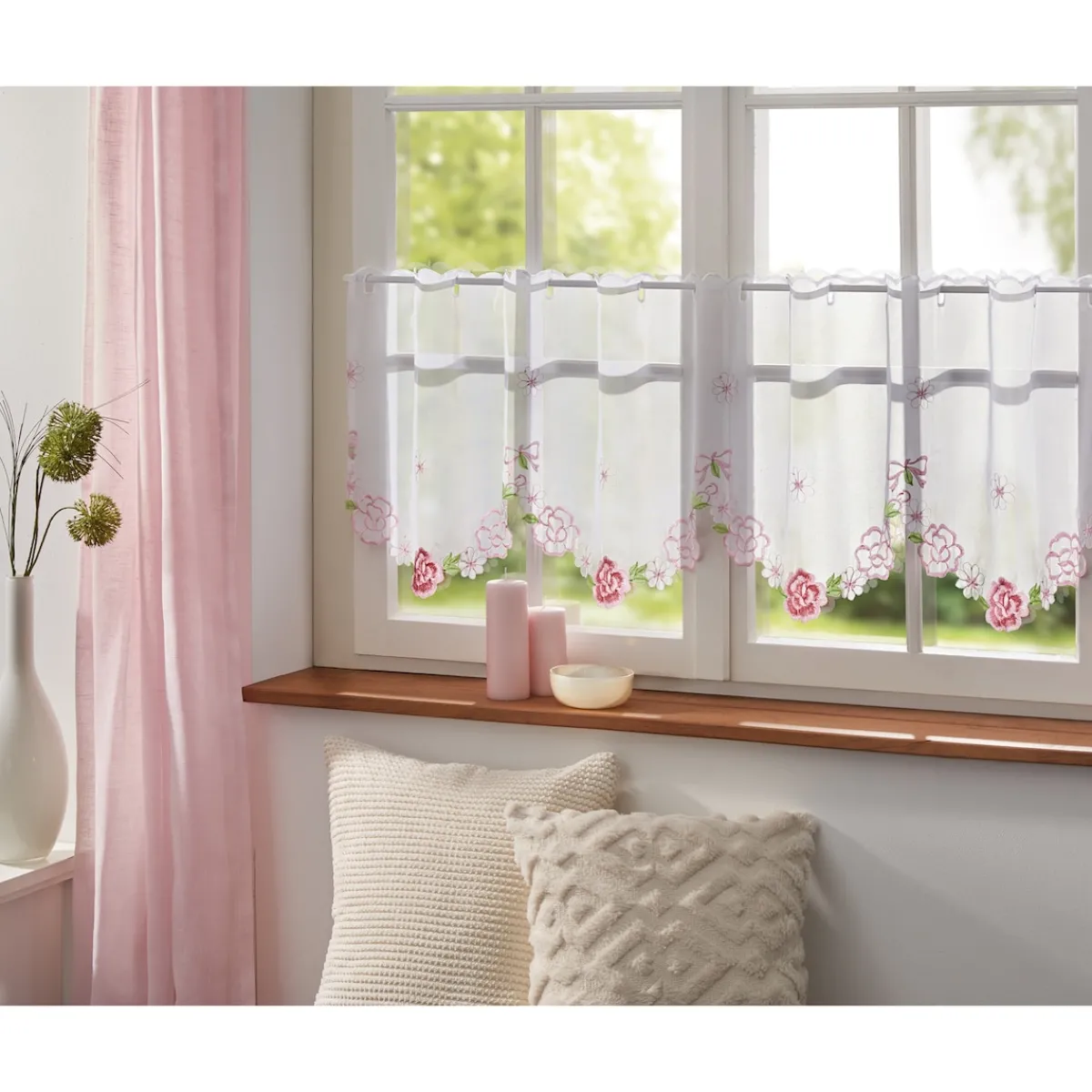 Sie lieben es romantisch? Dann wird diese zauberhaft luftige Bistrogardine garantiert Ihr Herz erobern. Aufwendig bestickt, ranken sich Rosen und Blätter an den Abschlussbögen entlang und verzaubern Ihr Zuhause auf charmante Art und Weise.