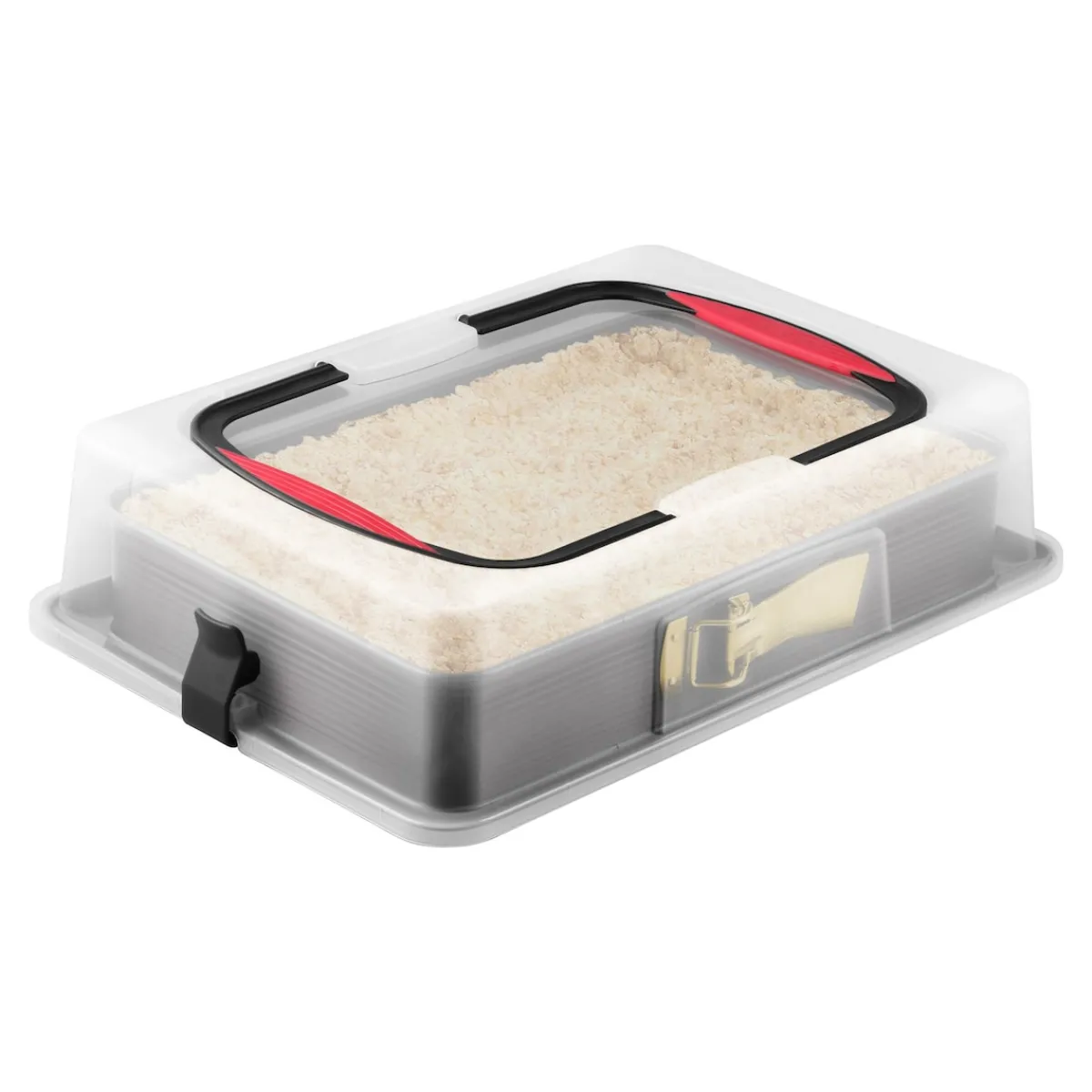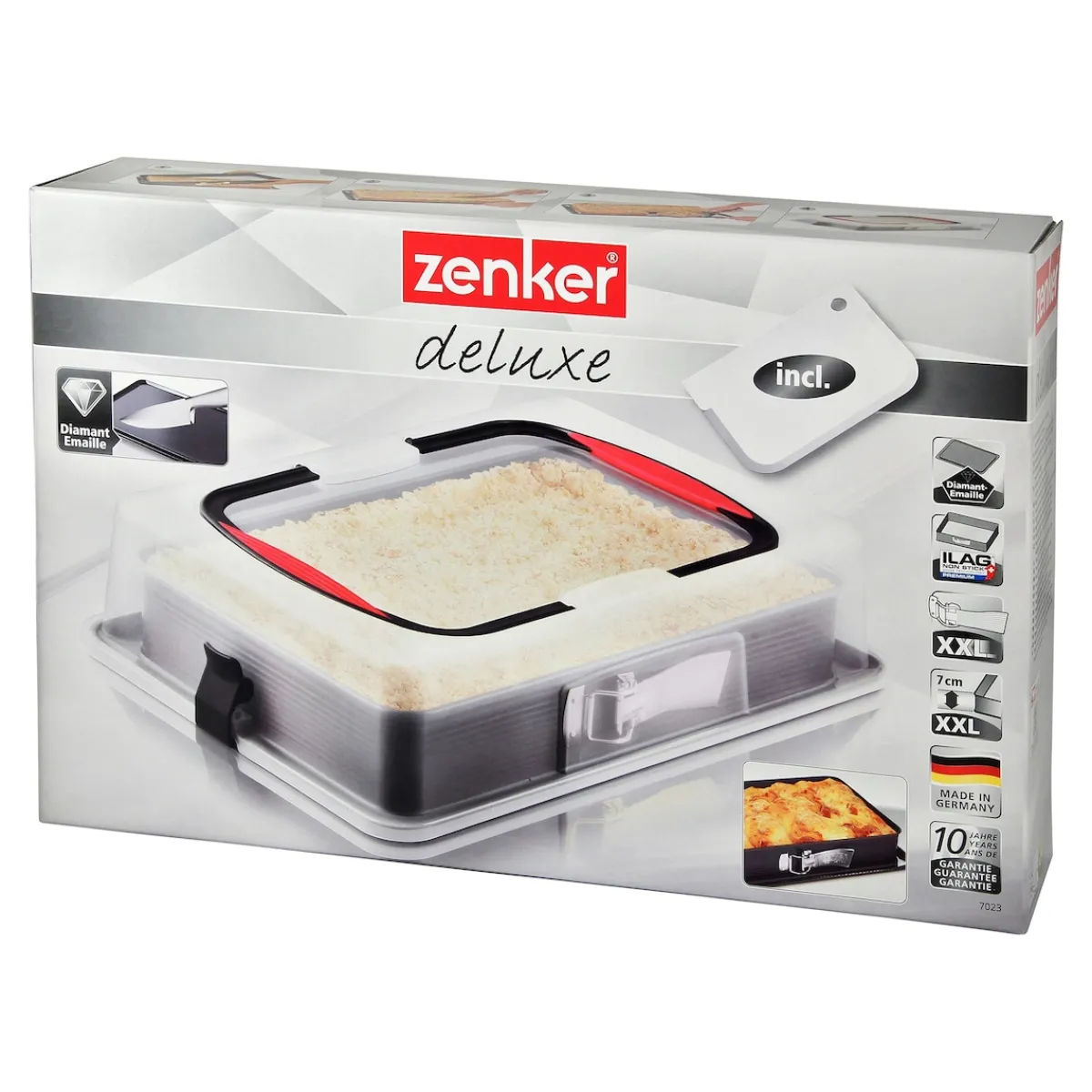 Die Rechteck-Springform Deluxe mit Emaille-Servierboden und transparenter Kunststoff-Transporthaube mit Soft-Griffen von Zenker (43,5 x 29,6 x 10,4 cm) eignet sich perfekt für das Backen, Servieren, Transportieren und Aufbewahren von Kuchen aller Art. Die stabile Transporthaube lässt sich direkt am auslaufgeschützten Rand befestigen und ermöglicht einen sicheren Transport der Backwaren. Dank der schnitt- und kratzfesten Diamant Emaille des Servierbodens kann der Kuchen direkt in der Form zerteilt und serviert werden. Der keramisch verstärkte Springform-Ring mit sehr guter Antihaftbeschichtung ILAG Premium verhindert das Anbrennen der Speisen und ermöglicht das einfache Entformen des Kuchens. Die Springform überzeugt mit einem extra hohen Konditorrand (ca. 7 cm) und mit Auslaufschutz. Die Springform mit 10 Jahren Qualitätsgarantie und extra großem Verschluss ist temperaturbeständig bis maximal +230°C. Servierboden und Tragehaube können in die Spülmaschine gegeben werden, der antihaftbeschichtete Springform-Ring wird per Hand gereinigt. Die extra hohe Haube und der auslaufgeschützte Rand sorgen dafür, dass auch höhere Kuchen oder mehreren Schichten unversehrt transportiert werden können und nicht ihre Form verlieren.