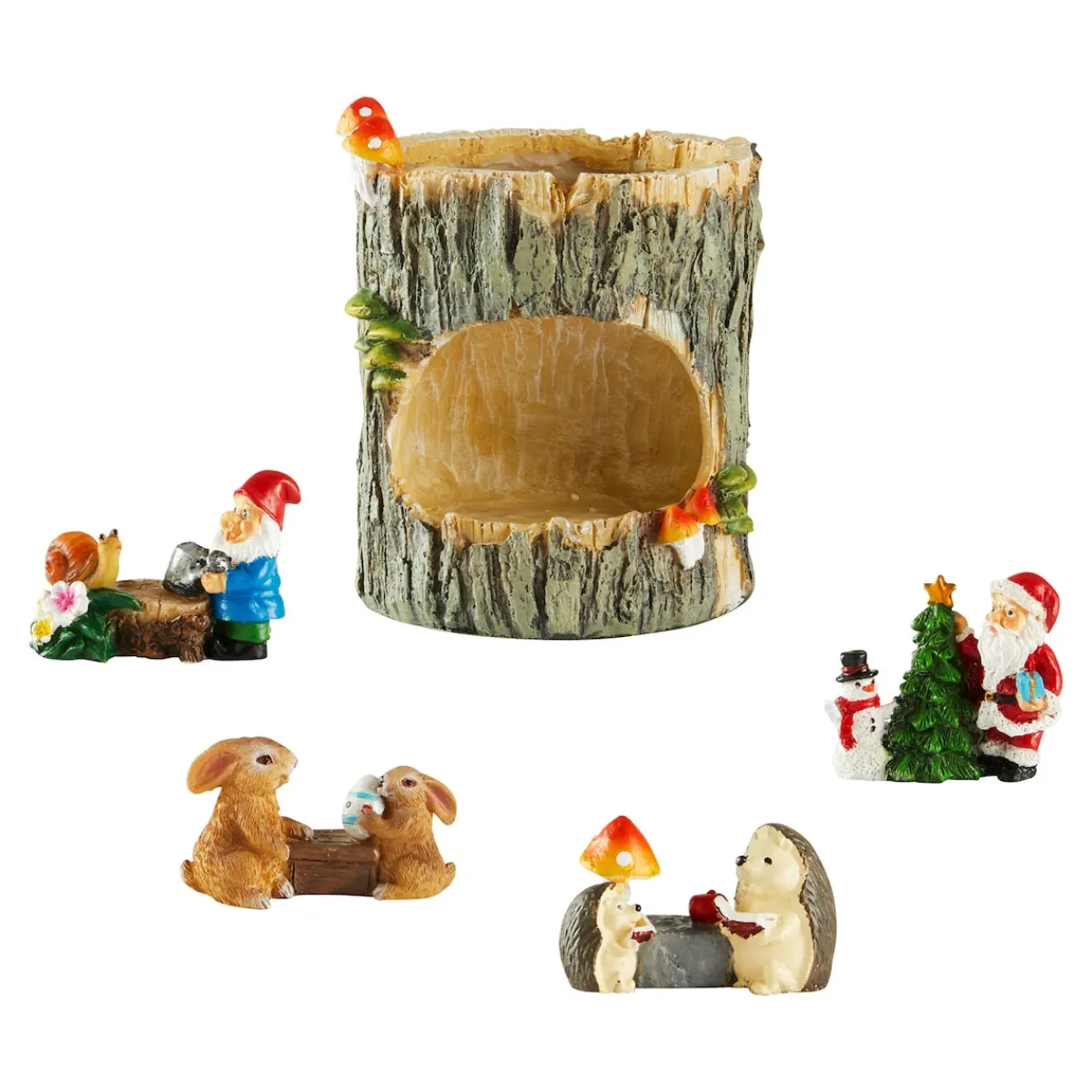 Eine entzückende Idee: Für diesen charmanten Pflanztopf in Baumrindenoptik haben Sie stets die passende Dekoration zur Hand! Gartenzwerg, Osterhäschen, Herbst-Igelchen und das niedliche Schnee-/ Weihnachtsmann-Duo wechseln sich – nach Jahreszeit – im Schaufenster ihres Zuhauses ab.