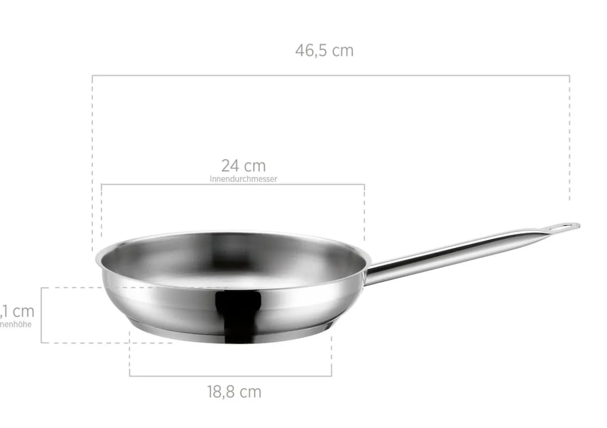 Die Bratpfannen aus Edelstahl sind mit den Durchmessern 24 cm, 28 cm und 32 cm erhältlich.