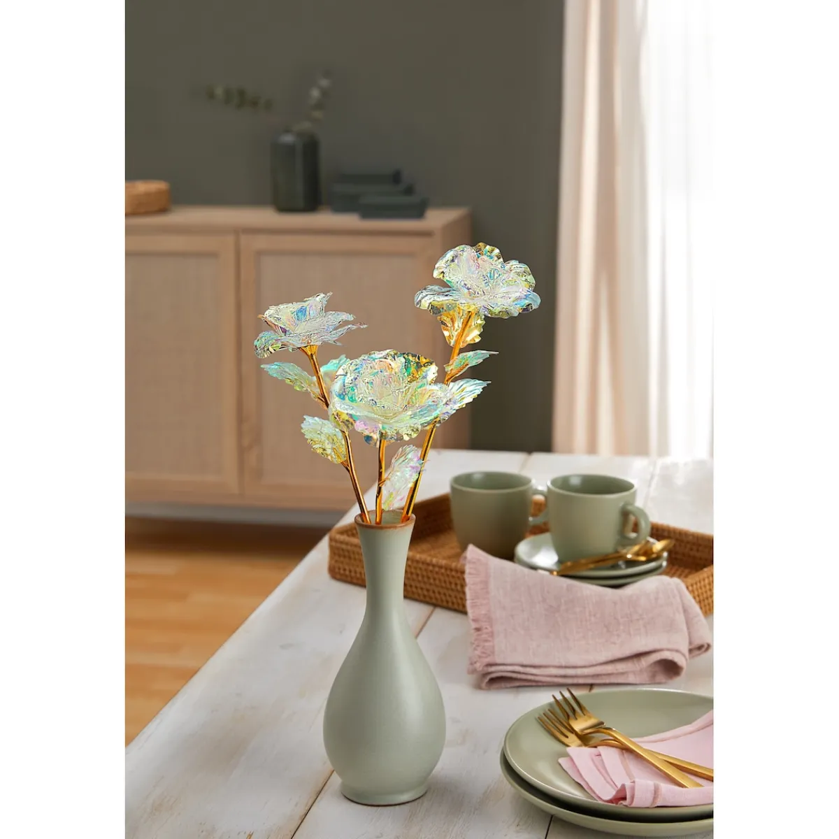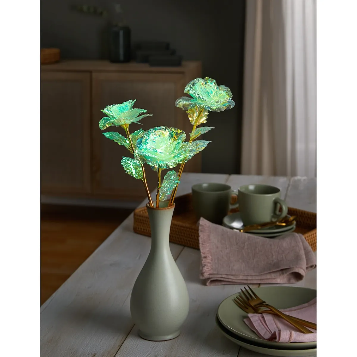 Am Tag umgibt das Rosentrio ein sanfter Schimmer von Perlmutt in sanften Farben – und in der Nacht leuchten die fein gearbeiteten Blüten in wunderschönen Grüntönen ganz von selbst. Ein geradezu magischer Anblick! Lieferung ohne Vase.