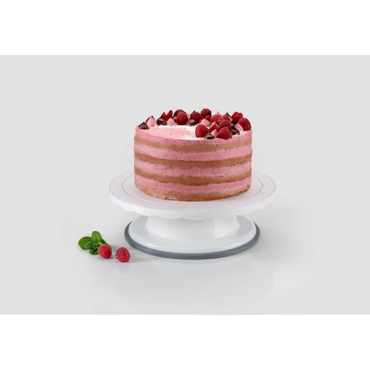 Die drehbare Tortenplatte von Dr. Oetker aus Kunststoff mit Antirutsch-Silikonboden lässt sich leicht drehen und bietet mit ihren Maßen von Ø 27,5 x 9 cm ideale Bedingungen zum Verzieren von Torten und Kuchen. Zudem ist sie spülmaschinengeeeignet.