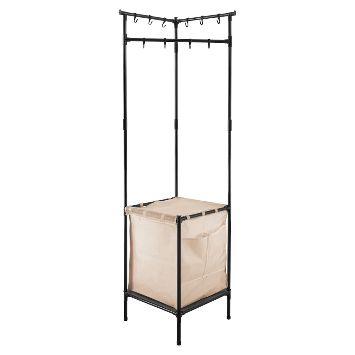 Sie möchten Ecken sinnvoll nutzen? Extra dafür konzipiert, bietet diese elegante Garderobe dank Kleiderstange, 10 Haken und Wäschesack mit Klettverschluss viel Platz für Ihre Kleidung. Die Innentasche sowie 2 Außensteckfächer am Beutel schaffen Stauraum für Socken und Co.