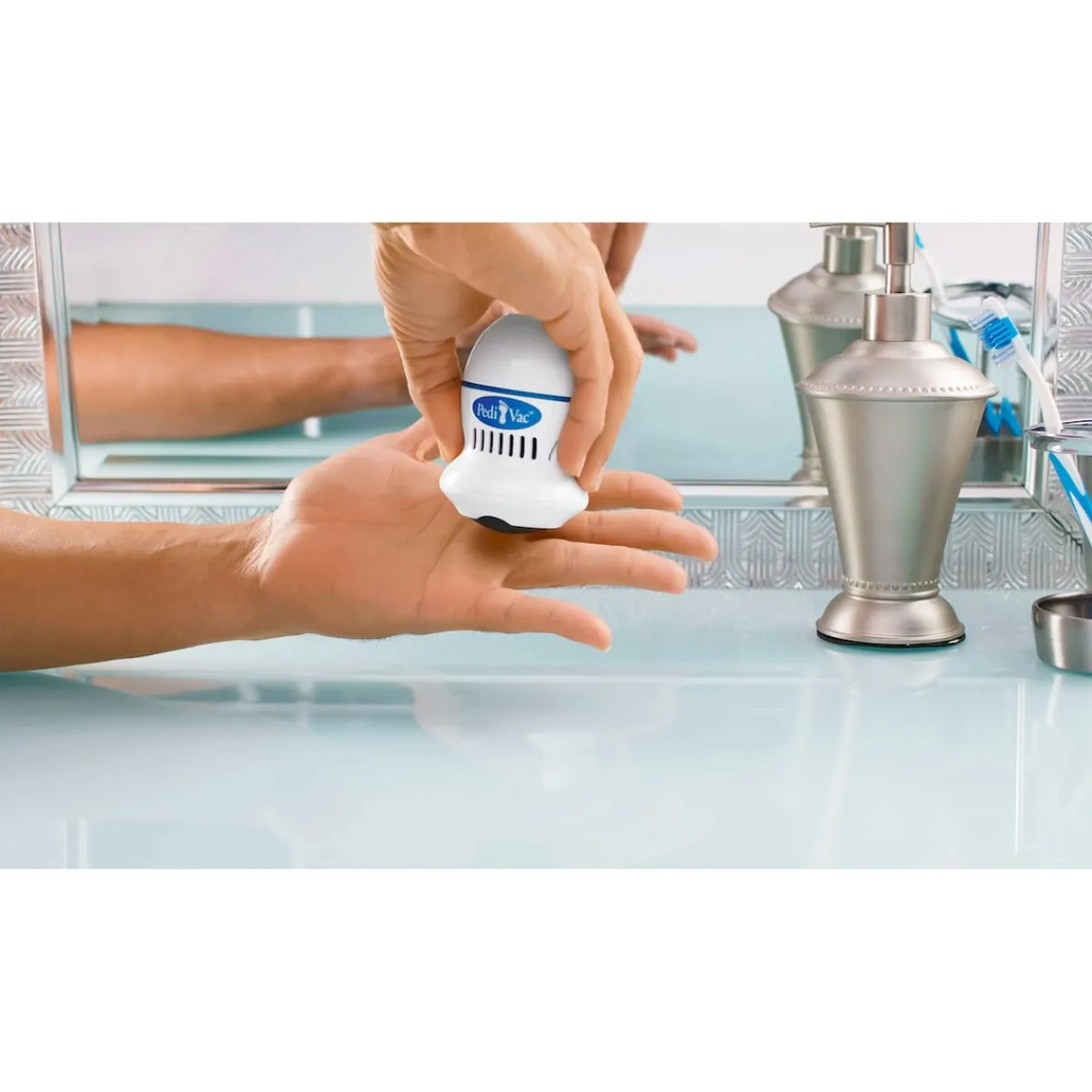 Der Clou: Die entfernte Hornhaut wird über die integrierte Saugfunktion direkt in den Auffangbehälter gesaugt, sodass nichts mehr auf den Boden fällt. Der Auffangbehälter lässt sich nach Gebrauch einfach entleeren und reinigen. Angetrieben wird der Pedi Vac per Akku, der sich ganz per USB wieder aufladen lässt. Praktisch: Einmal aufgeladen ist das Gerät überall und jederzeit einsetzbar und ist deshalb auch ideal fürs Reisegepäck.
