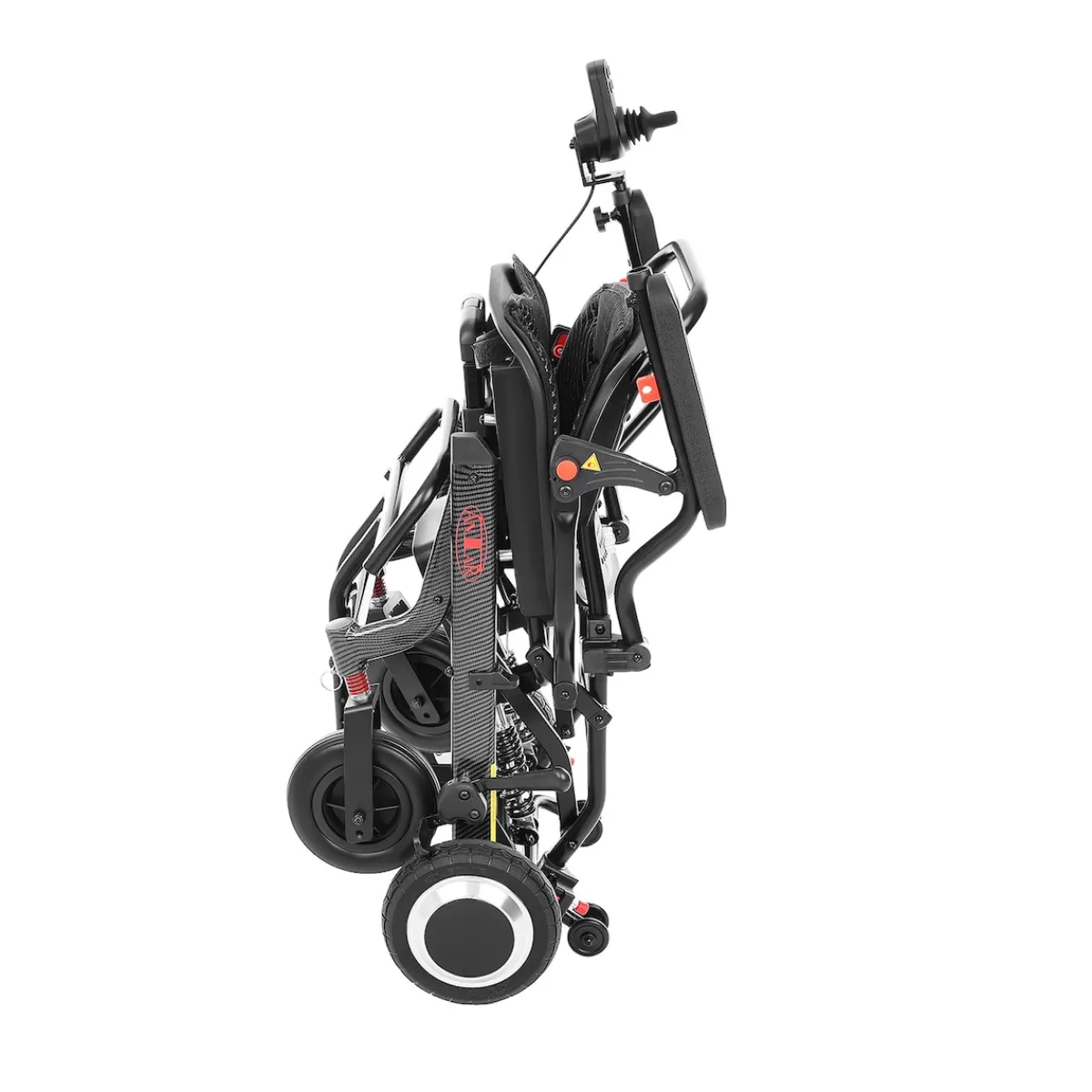 Für zusätzliche Sicherheit sorgen Feststellbremsen und eine Verriegelung, die ein unbeabsichtigtes Zusammenklappen verhindert. Ein Kippschutz sorgt für mehr Stabilität, besonders auf unebenem Gelände.