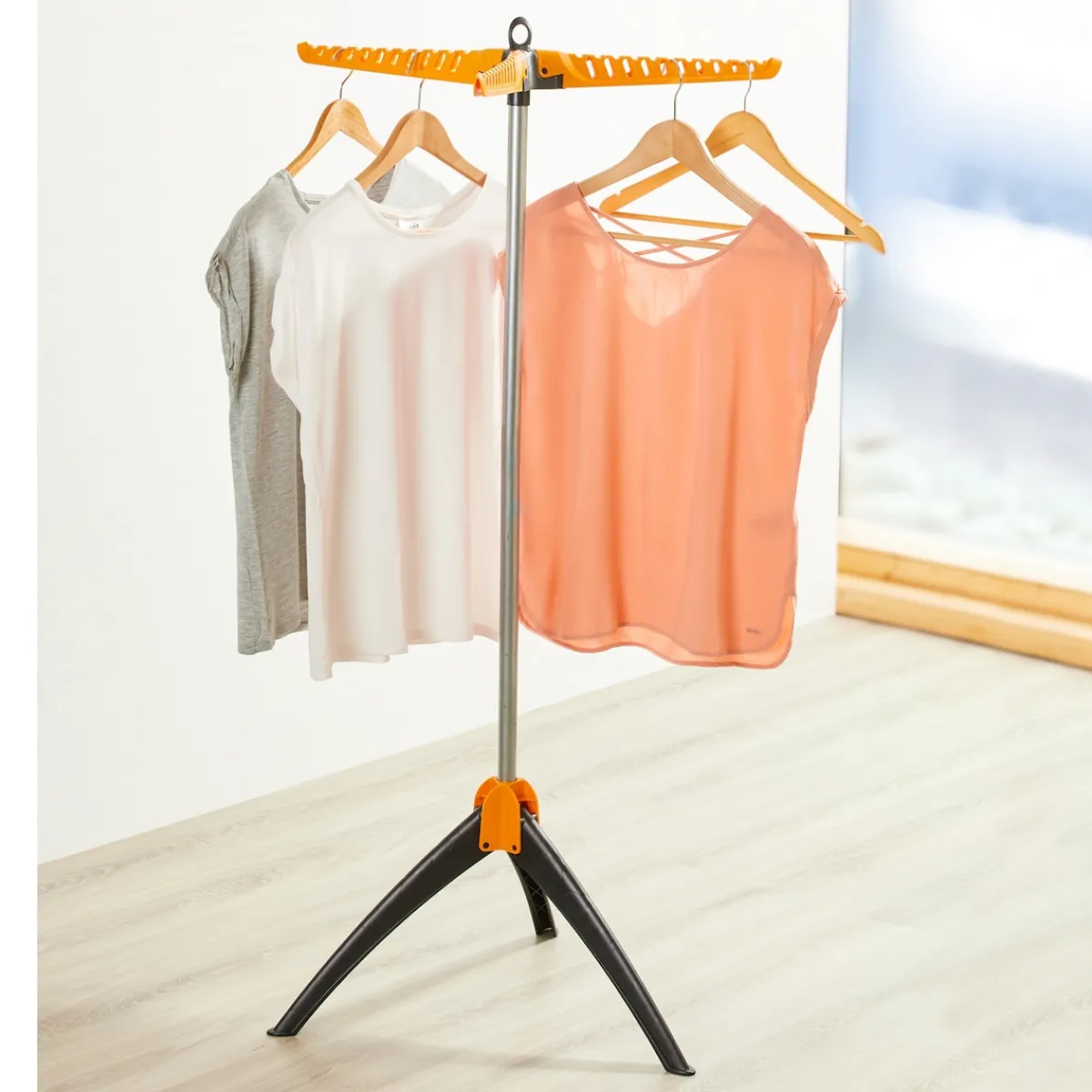 Als ebenso praktisch erweist sich der nur etwas mehr als ein Kilogramm schwere Ständer bei Regenwetter oder im Sommer. Nasse Kleidungsstücke wie Badeanzüge, T-Shirts oder Handtücher lassen sich mit dem Haushaltshelfer komfortabel an der frischen Luft trocknen. Da das Stahlgestänge rostfrei ist, sind die Nutzung im Freien und der Kontakt mit feuchter Wäsche kein Problem. So kann der langlebige Kleiderständer problemlos als Trocknerersatz in der Waschküche oder auf dem Balkon oder der Terrasse stehen, um zum Beispiel Kleidung nach Feiern oder Restaurantbesuchen auszulüften.