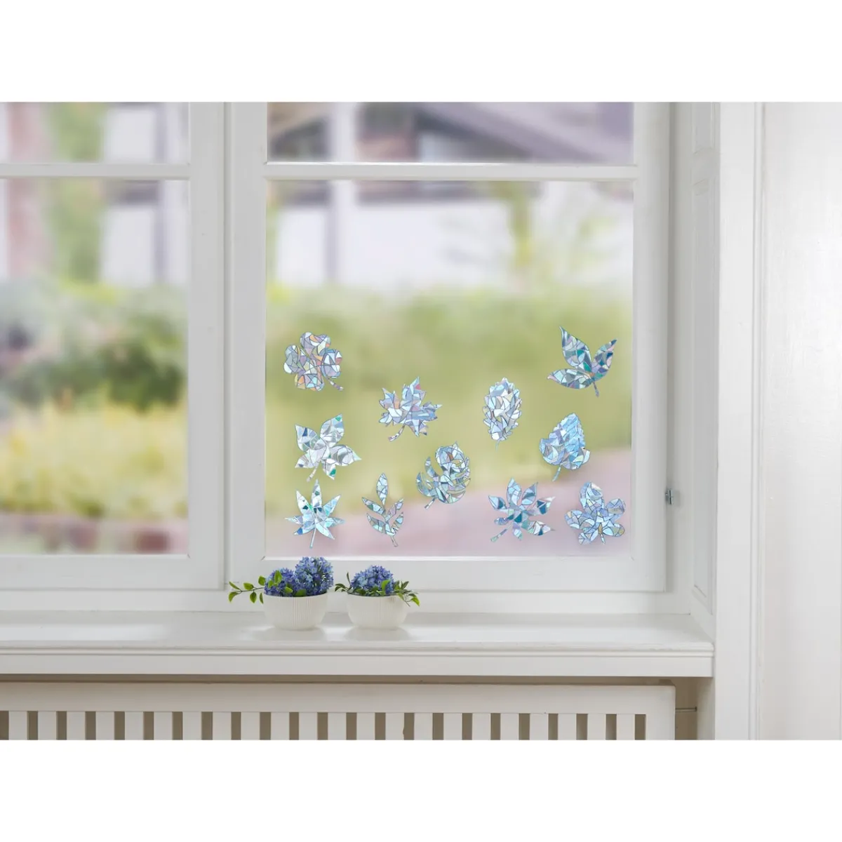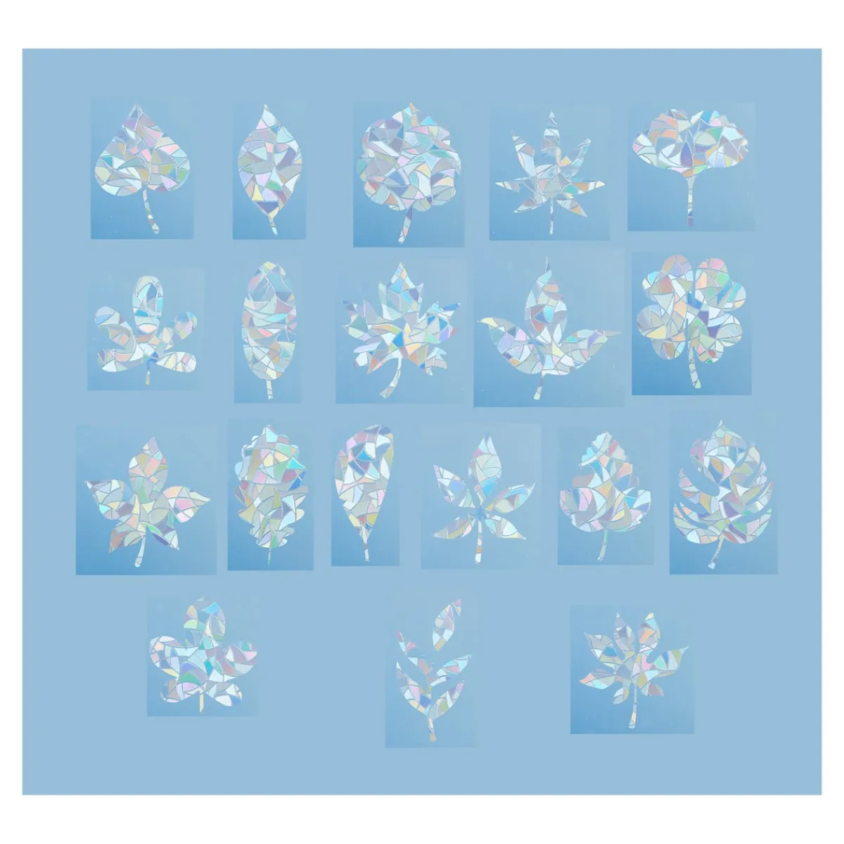 Ans Fenster geklebt, sorgen die Sticker in verschiedenen Blattformen für strahlend schöne Aussichten! Bei Lichteinfall leuchten sie in allen Farben des Regenbogens wie ein funkelnder Kristall. Nicht nur hübsch, sondern auch nützlich: Sie dienen auch als Sichtschutz und verhindern, dass Vögel gegen die Scheibe fliegen! Leicht und rückstandsfrei abzulösen, wiederverwendbar!