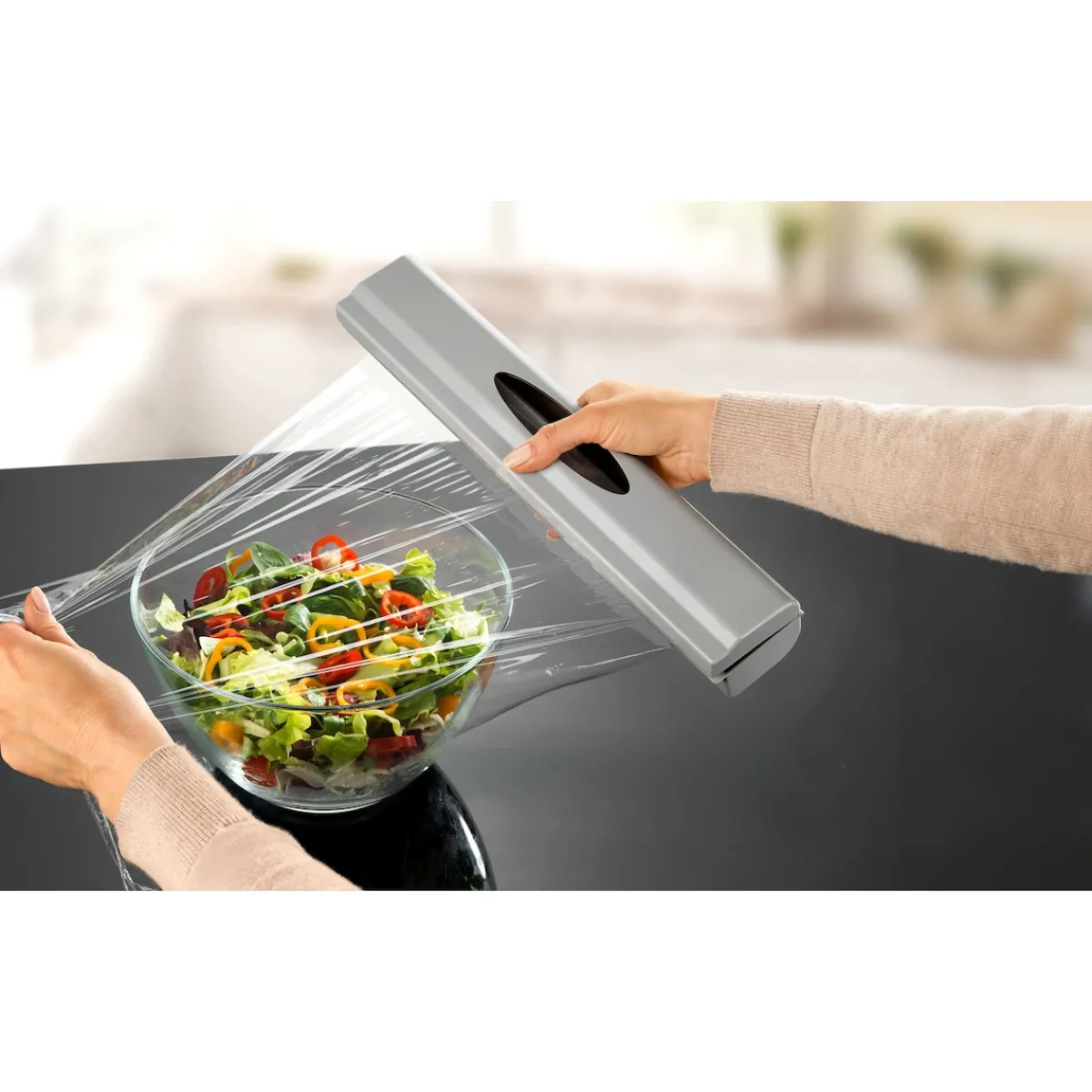 Die Handhabung ist denkbar einfach: Sie müssen lediglich die gewünschte Länge an Folie auf Spannung halten und den Spender zusammendrücken, die fein gezahnte Klinge schneidet sie präzise ab. Die Abmessungen des Spenders sind 36 x 5 x 7 cm, was ihm das perfekte Format für jede Küchenschublade gibt. Ein weiterer Vorteil: Er ist bis zu einer Rollenbreite von 30 cm größenverstellbar. Die Farbe ist Grau mit einem ovalen Sichtfenster.