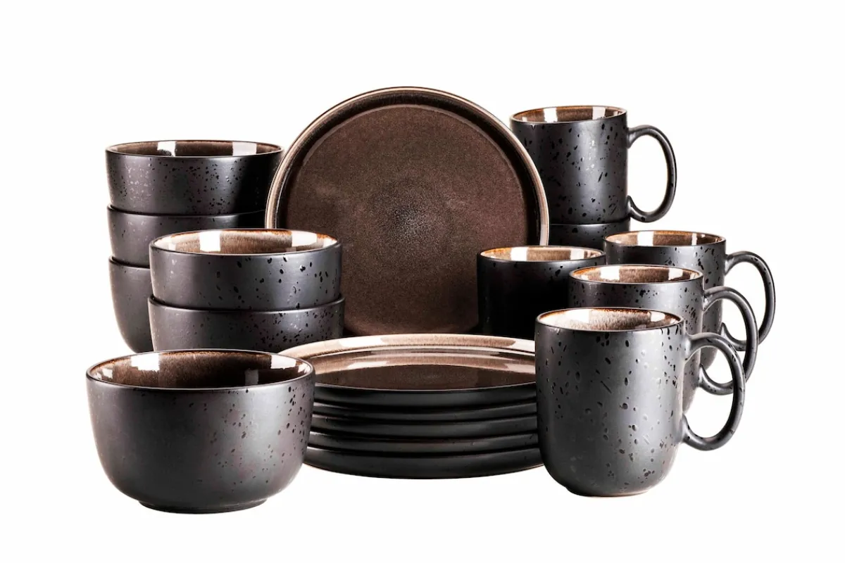 Die unvergleichliche Keramikgeschirr-Serie „Niara“ der österreichischen Traditionsmarke Mäser verbindet auf einzigartige Weise selbstbewusste skandinavische Formen mit zwei unterschiedlichen, aufwändigen Glasurtechniken: Auf den Ober- bzw. Innenseiten der Geschirrteile fließen strahlende Farbschattierungen auf schwarzem Untergrund zu wunderbaren Maserungen zusammen. Die Außen- bzw. Unterseiten hingegen bestechen durch eine Mattglasur in Schwarz, welche mit glänzenden schwarzen Sprenkeln überzogen wurde. Durch die händisch aufgetragenen Farben ist jedes Teil in dieser Kollektion auf allen Seiten einzigartig gemustert. Mit ihrem exquisiten und individuellen Charakter ist die Kollektion „Niara“ ein echter Hingucker auf jedem Esstisch. Gefertigt aus langlebigem, hochwertigem Steinzeug (welches nicht mit dem deutlich brüchigeren Steingut zu verwechseln ist) wird Ihnen dieses Geschirrset lange Freude bereiten. Selbstverständlich ist die gesamte Serie „Niara“ mikrowellen- und spülmaschinengeeignet. Dieses Set wird in einer vielfach auf Bruchsicherheit getesteten Paketversandverpackung aus ressourcenschonenden Materialien versendet. Bitte beachten Sie: Diese Kollektion wird händisch lasiert, wodurch minimale Unebenheiten der Glasur, kleine Einschlüsse und leichte Farbabweichungen auftreten können. Zur besseren objektiven Vergleichbarkeit gehen unsere Füllmengenangaben von einer randvollen Befüllung aus.