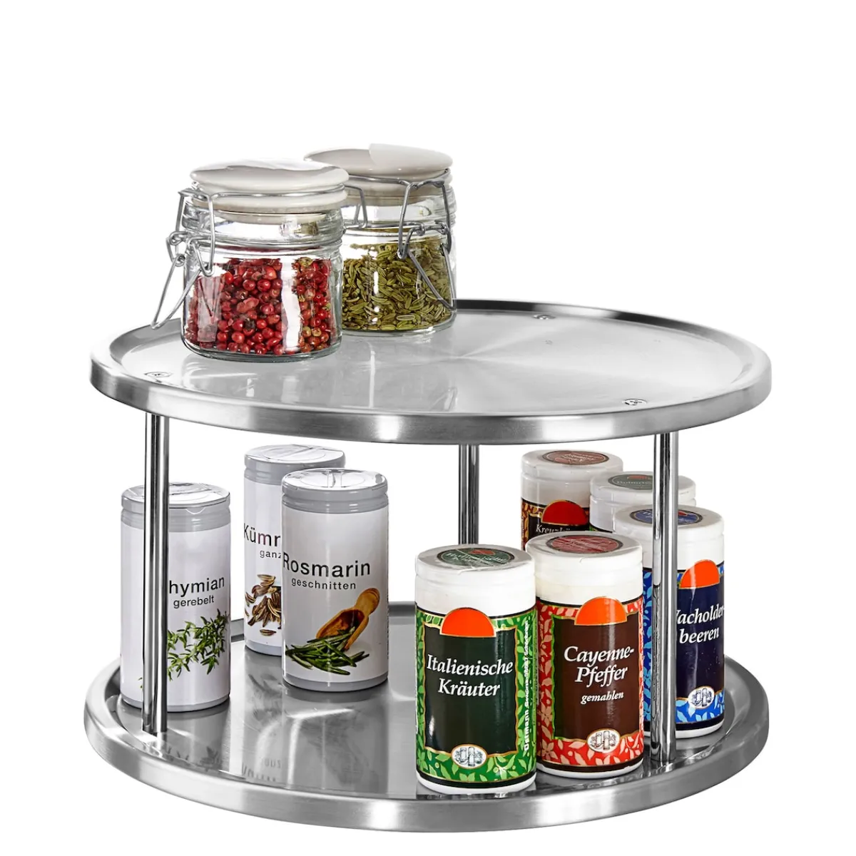 Mit seiner edlen Optik macht das Schrankrondell aber nicht um Schrank eine gute Figur, sondern bietet sich auch als dekorative Ordnungslösung für die Arbeitsplatte an. Besonders Hobbyköche lieben das Doppeldecker-Rondell, denn seine beiden Etagen lassen sich nutzen, um häufig verwendete Gewürze, Kräuter, Öle und Essige aufzubewahren. Langes Kramen im Gewürzregal gehört damit der Vergangenheit an, denn Salz, Safran oder das gute Walnussöl sind immer nur einen Dreh entfernt.