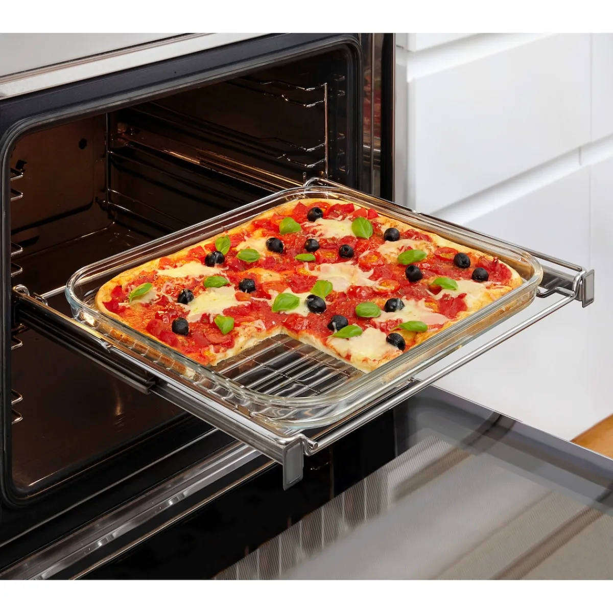 Die leichte, bruchfeste Glas-Backblech ist ein wahres Multitalent. Sie können sie sowohl zum Grillen als auch zum Backen verwenden. Anschließend dient sie als dekorative, schnittfeste Servierplatte.
