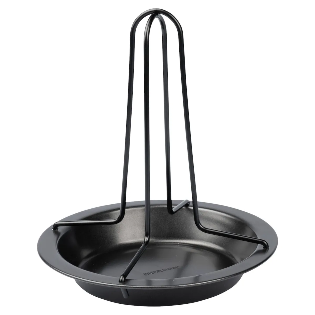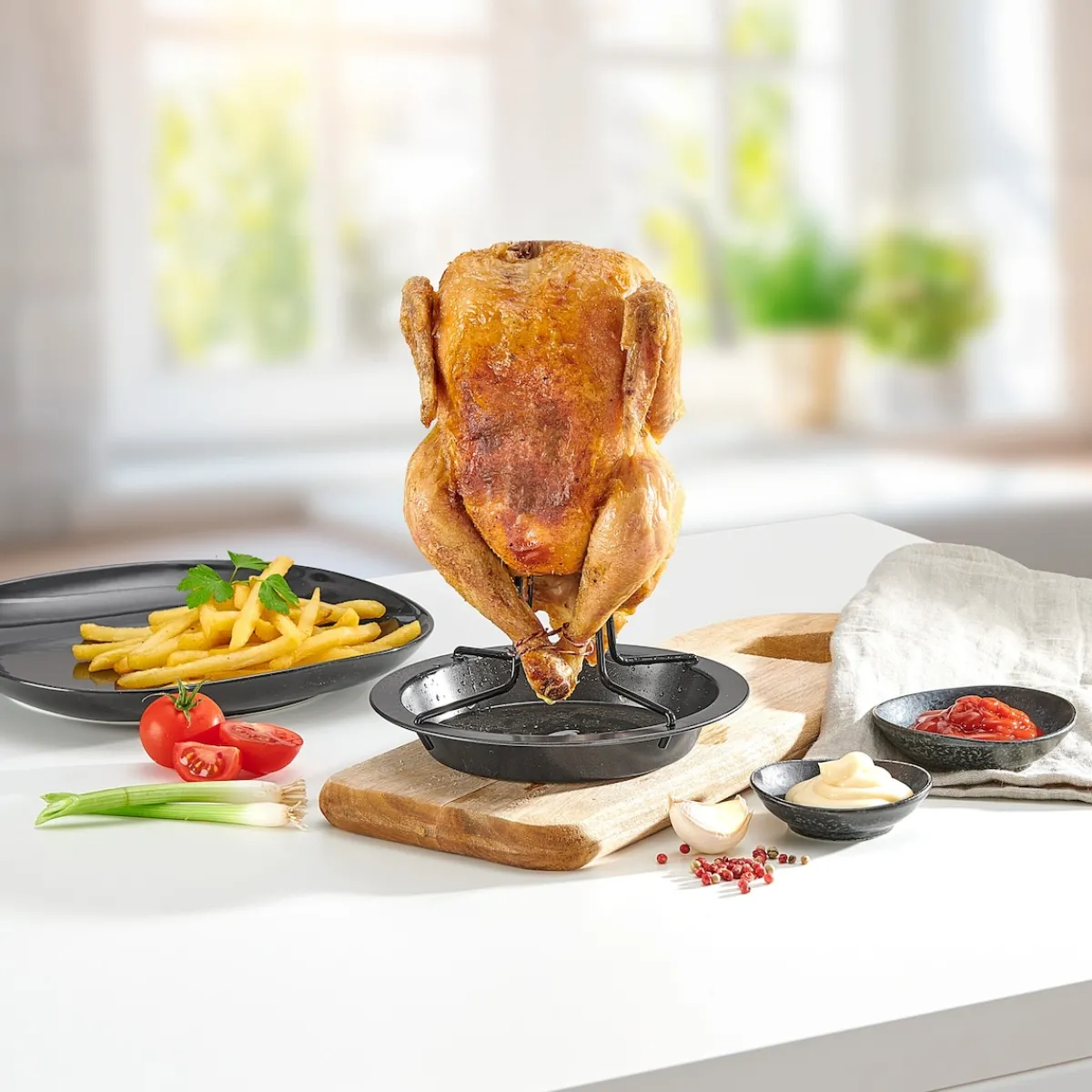 Dieser Hähnchen-Bräter vereinfacht auf köstliche Weise die Zubereitung Ihres saftigen Brathähnchens im Ofen und auf dem Grill: Einfach über den antihaftbeschichteten Ständer stecken und los geht’s. Mit praktischer Abtropfschale.