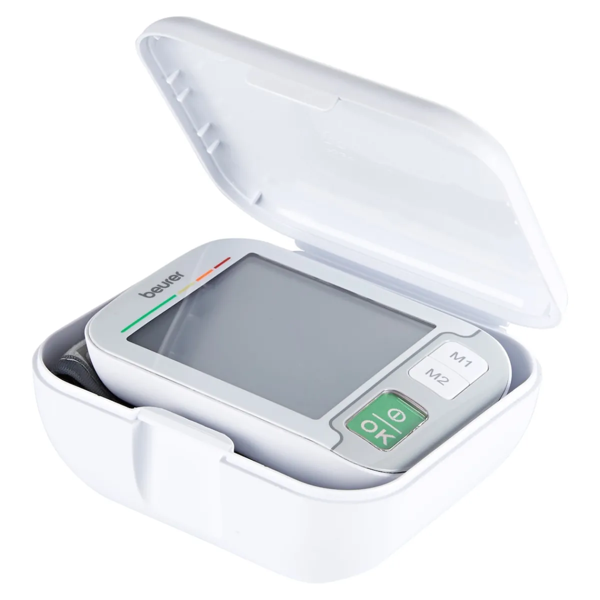Mit Risikoindikator (Farbskala) für Herzrhythmusstörungen. Blutdruck- und Pulsmessung erfolgt vollautomatisch. Großes Display, flaches Design. Speichert 120 Messwerte. Inklusive Aufbewahrungsbox.