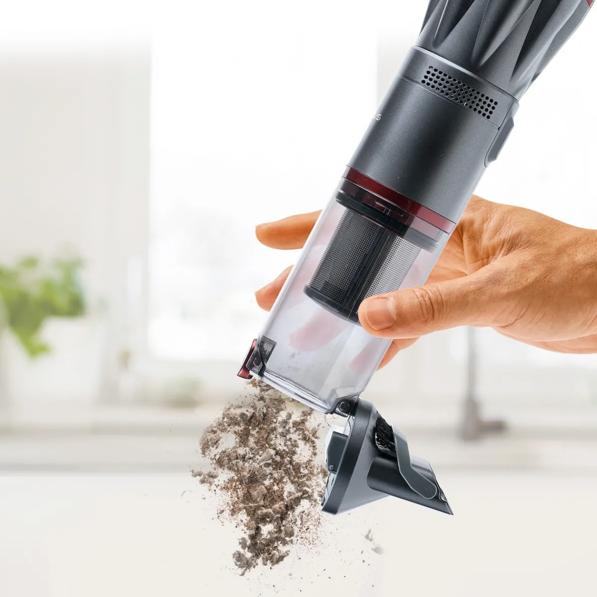 Dank seines schmalen Designs gelangt der Handstaubsauger problemlos in alle Ecken und Spalten. Auch schwer zugängliche Stellen unter bzw. hinter Kühlschränken, Möbeln und Heizungen sind für den wenigen Allrounder kein Problem.