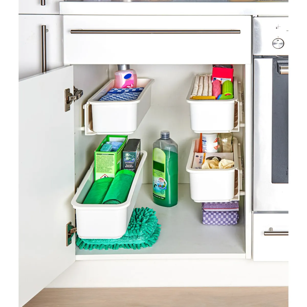 Die beiden ausziehbaren Haushaltsfächer sorgen blitzschnell für Ordnung: Dank Klebestreifen auf einer Seite lassen sich die Fächer kinderleicht überall da befestigen, wo Sie mehr Übersicht und Platz benötigen. So verwandeln Sie ungenutzte Flächen in Nischen, unter der Spüle u.v.m. in praktischen Stauraum!