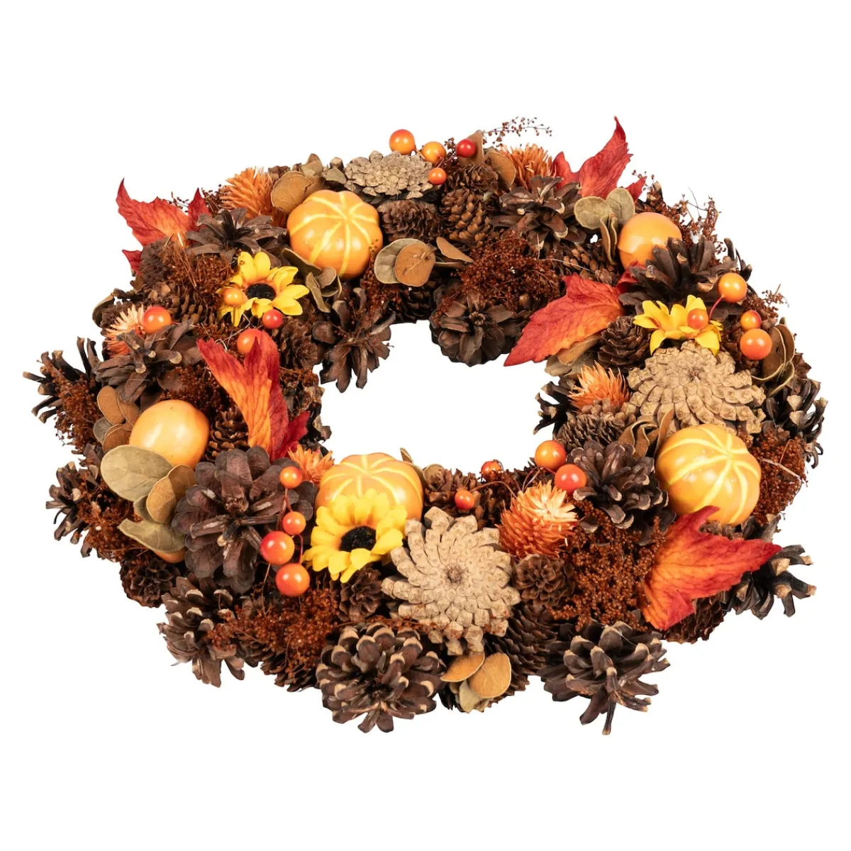 Ein herbstliches Willkommen für Sie und Ihre Gäste: An der Tür aufgehängt, empfängt dieser Kranz mit naturgetreuen Kürbissen, Blättern und stimmungsvoller Atmosphäre. Mit echten Tannenzapfen.