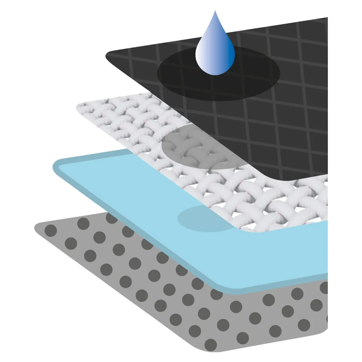 Immer ein gutes Gefühl – maximaler Schutz und Komfort. Dank ihrer 4 Funktionslagen nimmt die Auflage Flüssigkeiten wie Urin oder Blut zuverlässig auf, schließt diese sicher ein und schützt vor durchsickernder Nässe. Mit rutschfesten Unterseite.