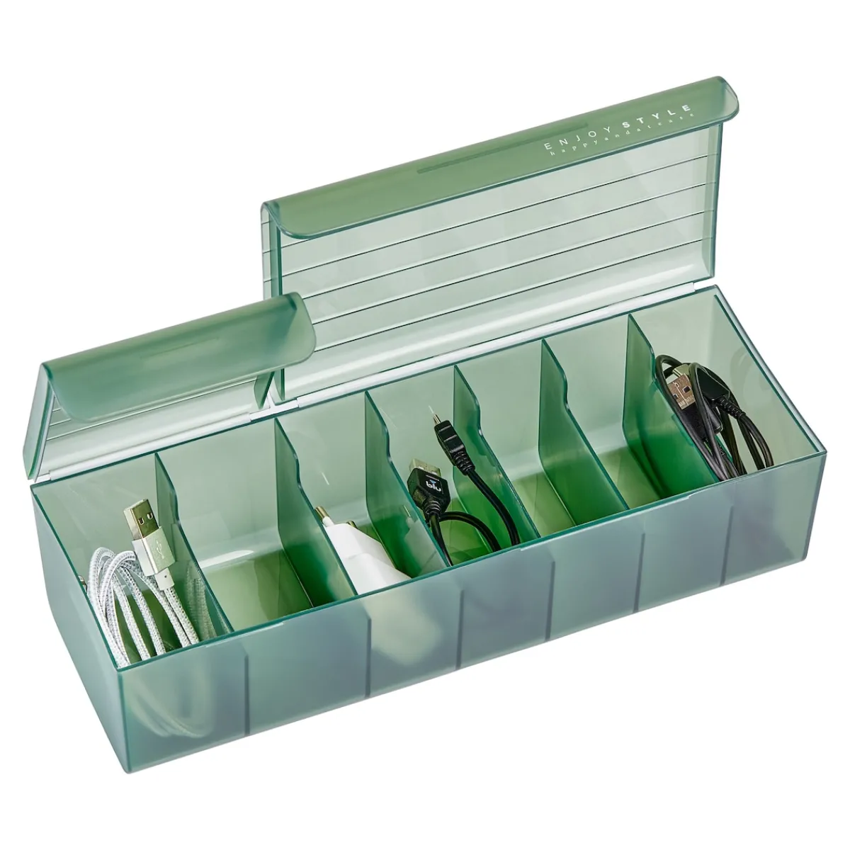 Ordnen Sie Ihre Kabel, Netzstecker, Kopfhörer und andere Kleinelektronik in dieser praktischen Aufbewahrungsbox. 7 Fächer sorgen für Übersichtlichkeit und der geteilte Deckel erleichtert den Zugriff.