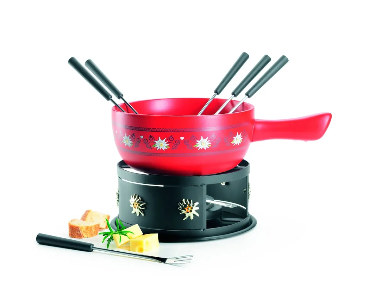 Bestehend aus: Fonduetopf (Ø 22,5 cm, 2,6 l), Fonduebrenner, Rechaud, Bodenplatte, Zwischenlage und 6 Fonduegabeln
