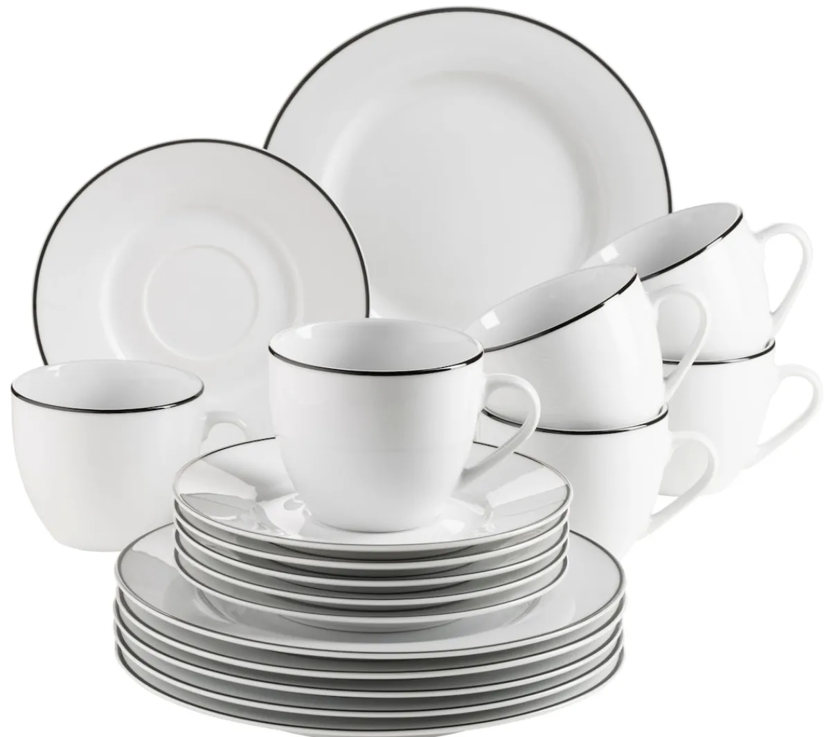 Das stilvolle Kaffeeservice Nola ist das ideale Geschirrset für entspannte Kaffee- und Frühstücksrunden mit bis zu 6 Personen. Das praktische Set besteht aus 6 x Kaffeetassen, 6 x Untertassen und 6 x kleinen Tellern für Kuchen und Desserts. Das hochwertige Porzellan in klassischem Weiß hat einen dünnen schwarzen Rand, welcher dem Set einen edlen, optischen Akzent verpasst und sich perfekt in modern, aber auch in klassisch eingerichtete Wohnungen einfindet. Nach jeder Verwendung kann das Geschirr einfach von Hand oder in der Spülmaschine gereinigt werden und ist zudem zum Aufwärmen in der Mikrowelle geeignet. Das Service wird zum Versand in einen bruchsicheren Karton verpackt. Perfekt kombinierbar mit dem dazu passenden Tafelservice im gleichen Design. Bitte beachten Sie: Zur besseren objektiven Vergleichbarkeit gehen unsere Füllmengenangaben von einer randvollen Befüllung aus.