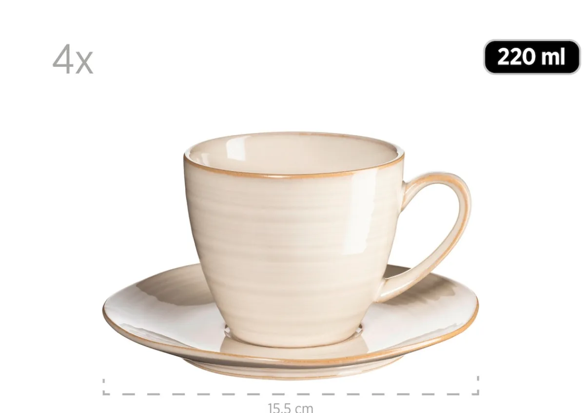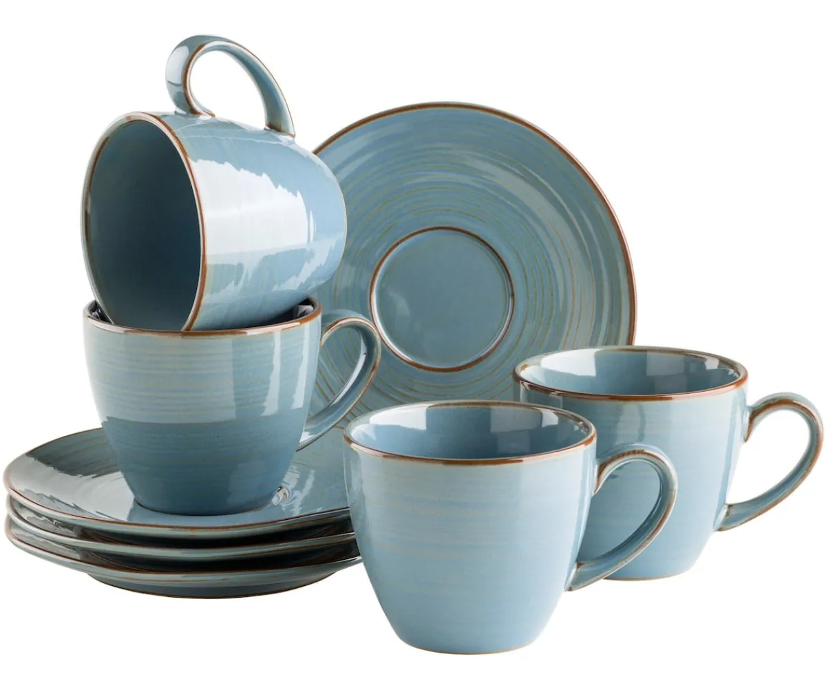 Moderner Brit-Chic für Ihren Esstisch – dieses Versprechen löst die Serie „Nottingham“ der österreichischen Traditionsmarke MÄSER perfekt ein: Aufwändig gefertigt aus hochwertigem Steinzeug, designed um eine aufregende Brücke zwischen Retro- und modernem Look zu schlagen. Neben seinem grundlegend unvergleichlichen Charakter glänzt dieses Kaffeetassen Set mit Untertassen für 4 Personen nicht zuletzt auch dadurch, dass kein Teil exakt wie das andere aussieht. Eine händisch aufgetragene reaktive Glasur und organische Formen anstelle von perfekten Rundungen sind hierfür ausschlaggebend. Alle Teile sind spülmaschinen- und mikrowellengeeignet, und dadurch äußerst pflegeleicht. Dieses Tassenset wird in einer vielfach auf Bruchsicherheit getesteten Verpackung aus ressourcenschonenden Materialien versendet. Im Sinn einer objektiven Vergleichbarkeit gehen unsere Füllmengenangaben von einer randvollen Befüllung aus. Bitte beachten Sie, dass durch die besondere Glasurtechnik alle Teile eine einzigartige Musterung aufweisen und farblich voneinander sowie vom abgebildeten Produkt abweichen können. Minimale Unebenheiten und kleine Einschlüsse in der Glasur können aufgrund des hohen handwerklichen Fertigungsanteils auftreten.