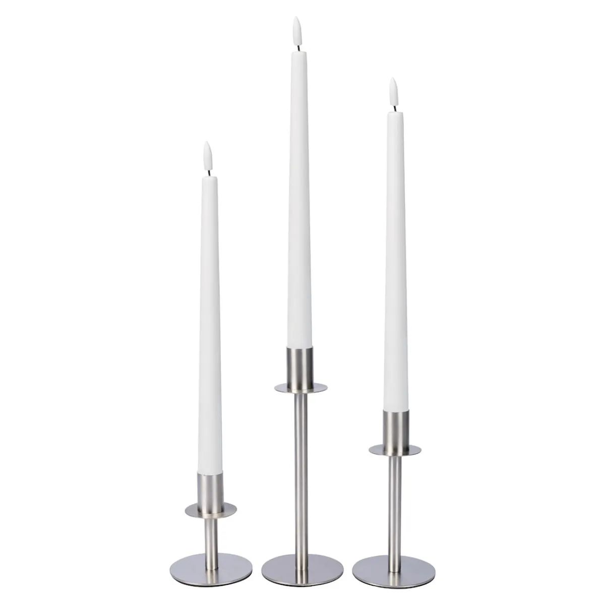 Inhalt: 3 LED-Echtwachskerzen, 3 Edelstahl-Kerzenständer