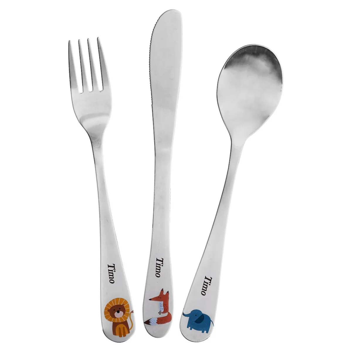 Die niedlichen Tiermotive sorgen gleich für gute Laune beim Ansehen und Benutzen des Bestecks. Über den Tiermotiven lässt sich der Name des Kindes individuell eingravieren.