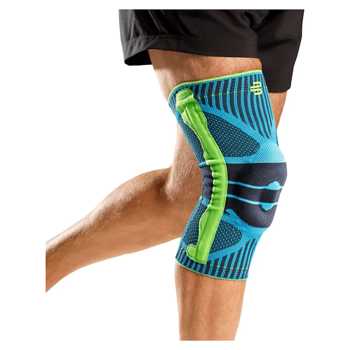 Knie können mithilfe dieser Bandage im Alltag oder beim Sport durch leichte Kompression gestärkt und vor Überlastung geschützt werden. Dabei verbessern sie die Stabilität, ohne die Bewegungsfreiheit einzuschränken. Die Kniescheibe wird durch eine anatomisch geformte Pelotte umschlossen und kann so Druckspitzen gezielt auffangen. Aus 50% Polyamid, 30% Elasthan, 20% Polyurethan. Waschbar bei 40°C. Größen: S, M, L, XL, 2XL